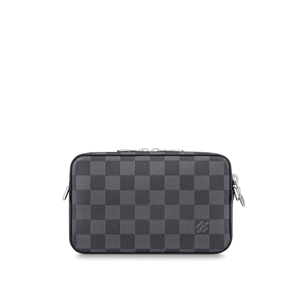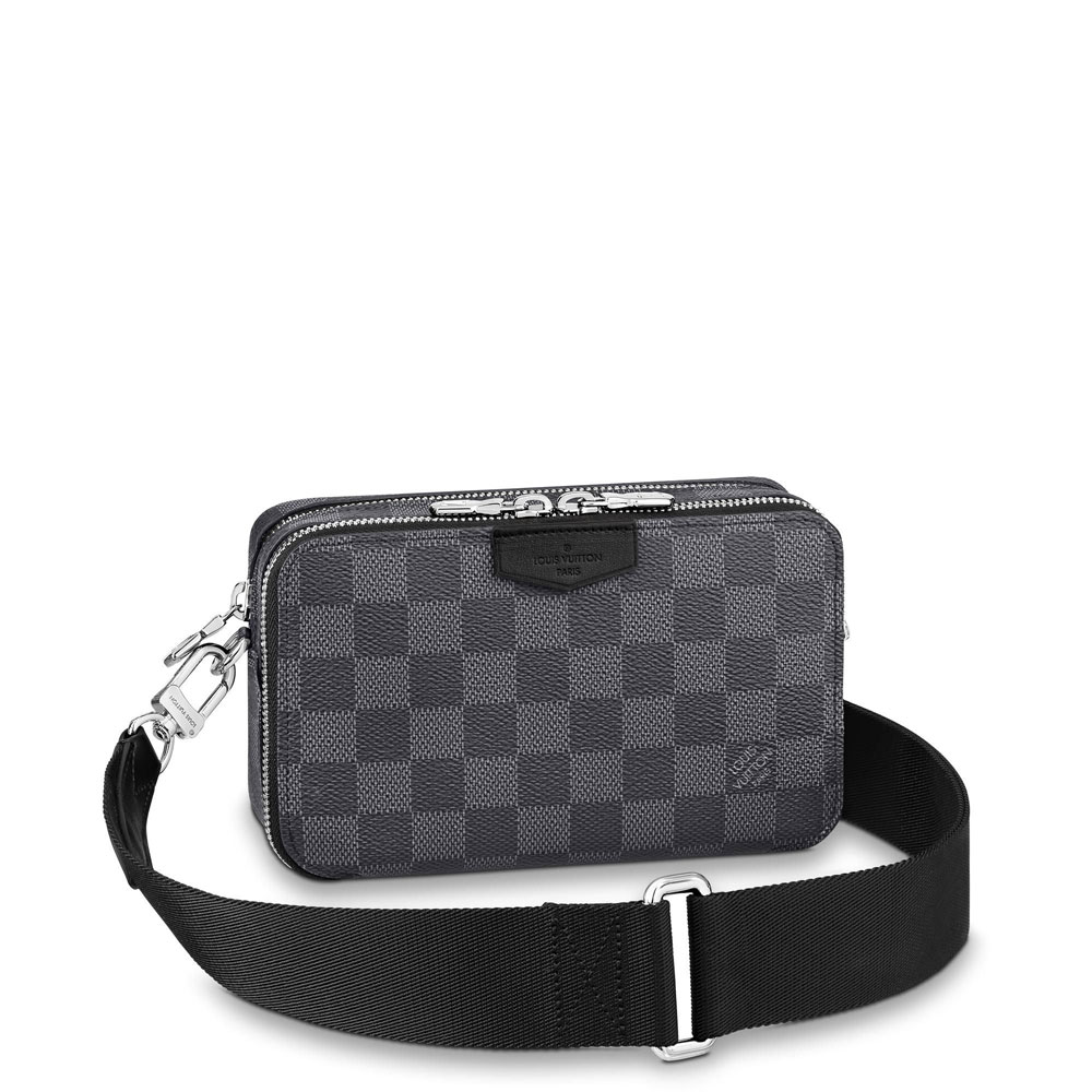 This Alpha Wearable Wallet is a versatile compact bag that can be carried in different ways. thanks to its adjustable and removable strap. Made from Damier Graphite canvas. it's trimmed in black leather. Its wide opening and side gussets give easy access to belongings inside. Perfect for carrying a phone (or two) and a wallet.