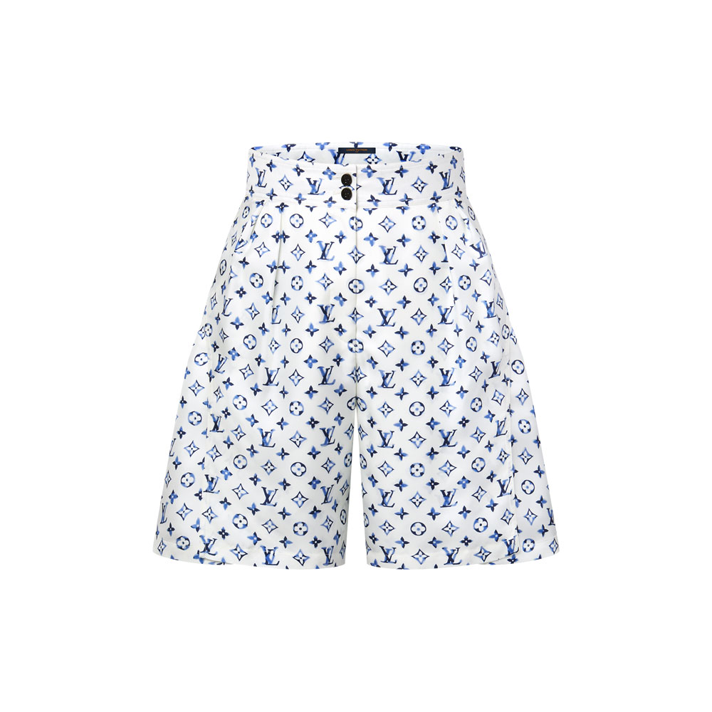 Style the Louis Vuitton Aquarelle Monogram Belt Shorts in Blue with effortless sophistication. Pair these flowy silk-blend shorts with a crisp white button-down shirt or a cropped linen blouse for a polished daytime look. For a relaxed vibe, try a fitted tank top in neutral tones like beige or ivory, accentuating the monogram watercolor pattern.