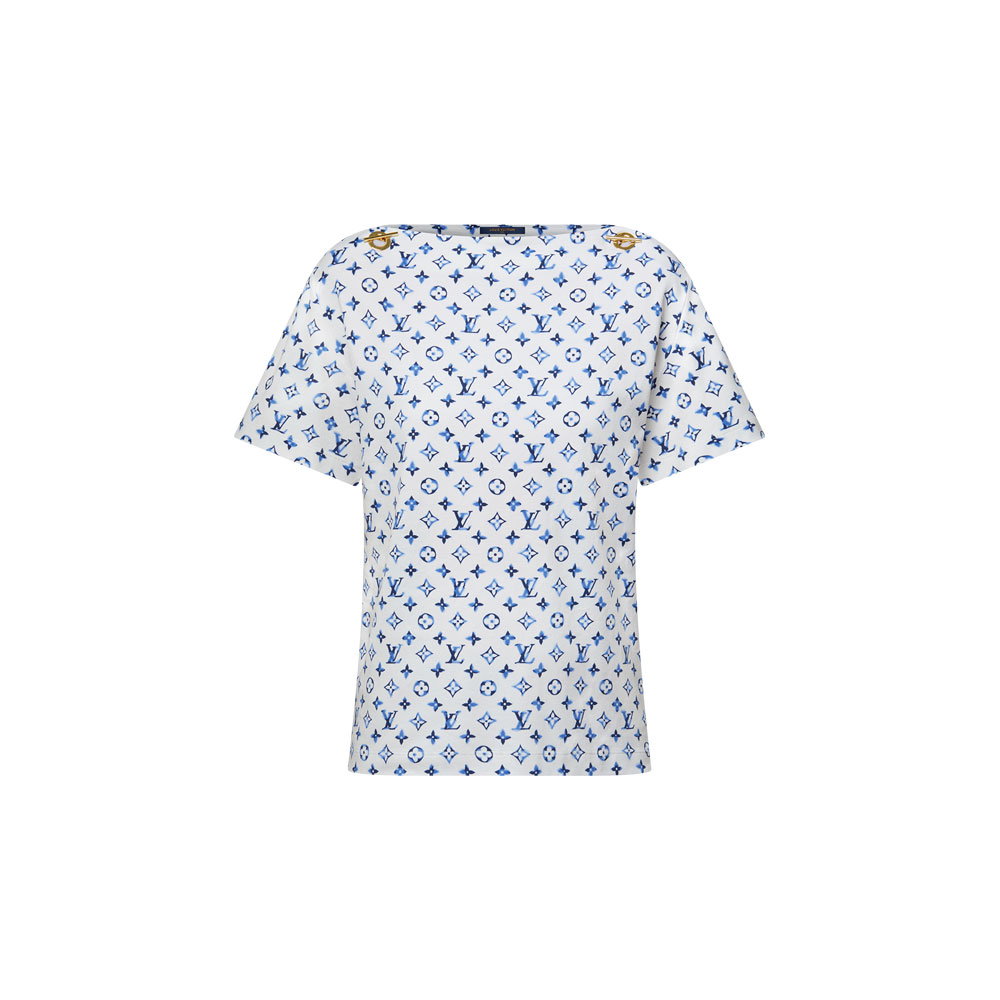Louis Vuitton Aquarelle Monogram Eyelet T-Shirt in Blue effortlessly blends luxury and nautical charm. Pair this timeless piece with crisp white tailored trousers for a polished daytime look, or layer it under a structured blazer for evening sophistication. The blue hue complements neutral tones like beige or ivory, while metallic accessories echo its grommet details.