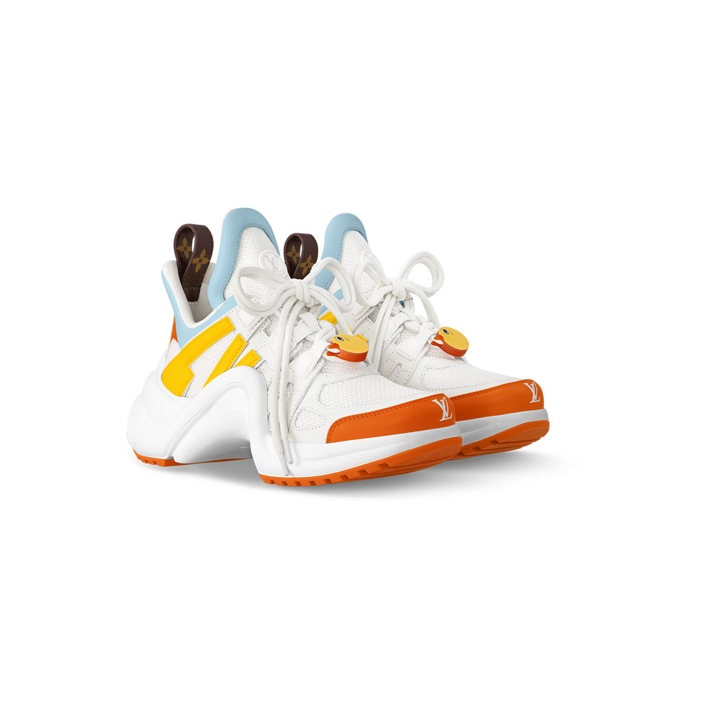 This version of the LV Archlight sneaker in calf leather and technical mesh is part of an exclusive collaboration between Louis Vuitton and Chinese artist Sun Yitian, known for her colorful depictions of mass-produced toys. The artist has created cute animal characters for the lace accessories of this iconic sneaker, which is instantly recognizable for its oversized, wave-shaped outsole.