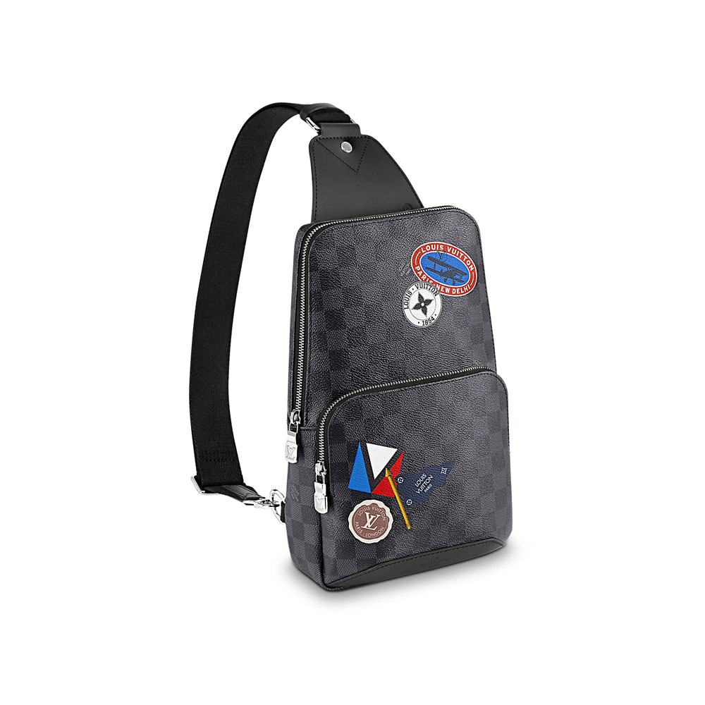 The Avenue Sling Bag explores and reinvents Louis Vuittons history, making the old new again with vintage LV travel stickers taking on college feel thanks to the imagination of Kim Jones.