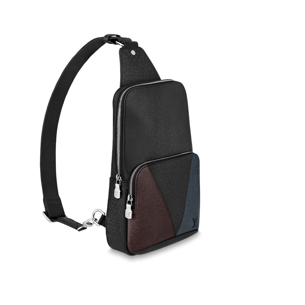 This new interpretation of the Avenue Sling Bag uses the art of leather marquetry to make a subtle signature statement. Panels of embossed Taiga leather in burgundy. black and navy blue are pieced together in a V pattern. evoking the House's logo. Multiple pockets and a body-friendly strap make it a classy. contemporary way to carry everyday essentials.