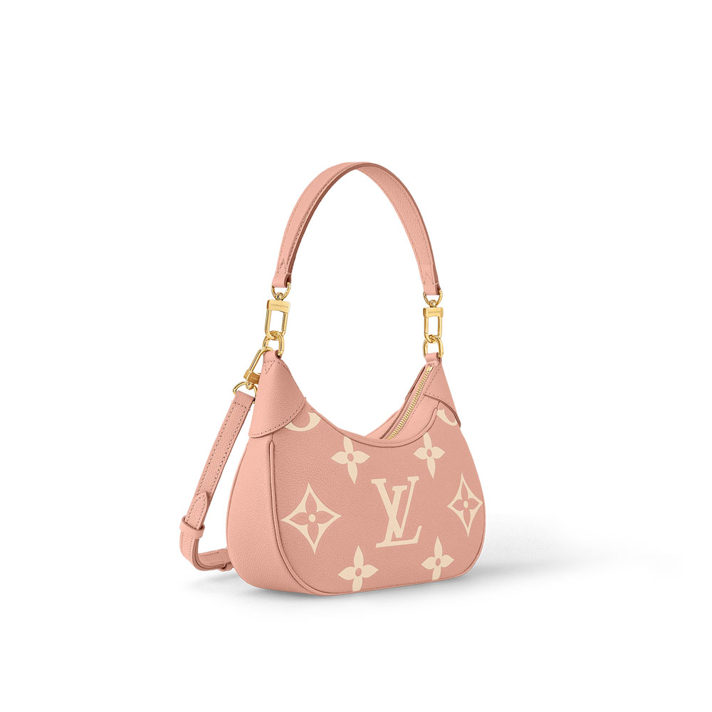 The Bagatelle mini hobo handbag is fashioned from lush grained Monogram Empreinte leather. The oversized. embossed pattern in a pink-and-cream colorway perfectly fits the bag's curves. The Bagatelle can be carried as a baguette-hobo. worn on the elbow. or cross-body with its detachable. adjustable strap.