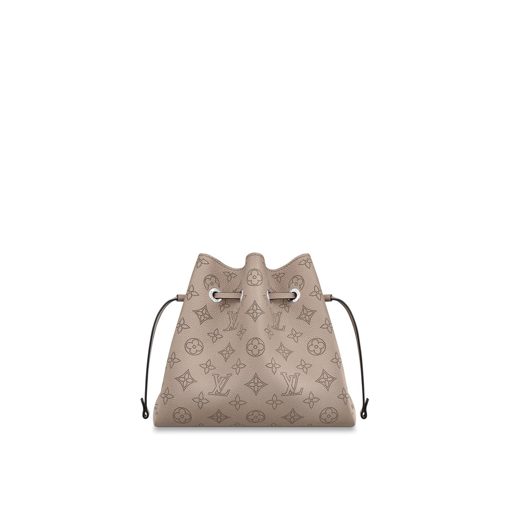 Louis Vuitton unveils the Bella bucket bag in Mahina calf leather with its perforated Monogram pattern. The bag's small size and the attached round coin purse. featuring a miniature version of the perforated Monogram motif on one side. make it modern. desirable and trendy. The sophisticated leather and metal mixed handle associated with a removable leather strap bring versatility.