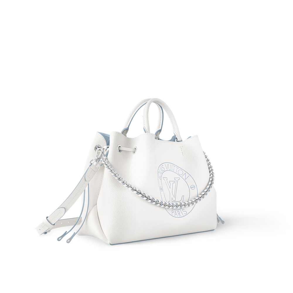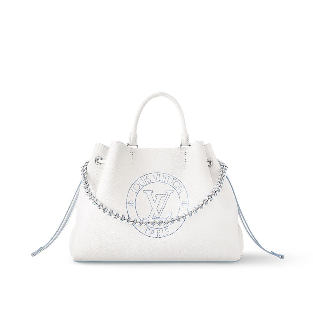 The roomy Bella Tote is made from Mahina perforated calfskin in a vivid white-and-blue colorway as part of the Aura Collection. The LV Circle motif evokes classic House design while the silver-color hardware, including the removable chain, brings a feeling of casual sophistication. The roomy interior has two compartments separated by a zipped pocket.