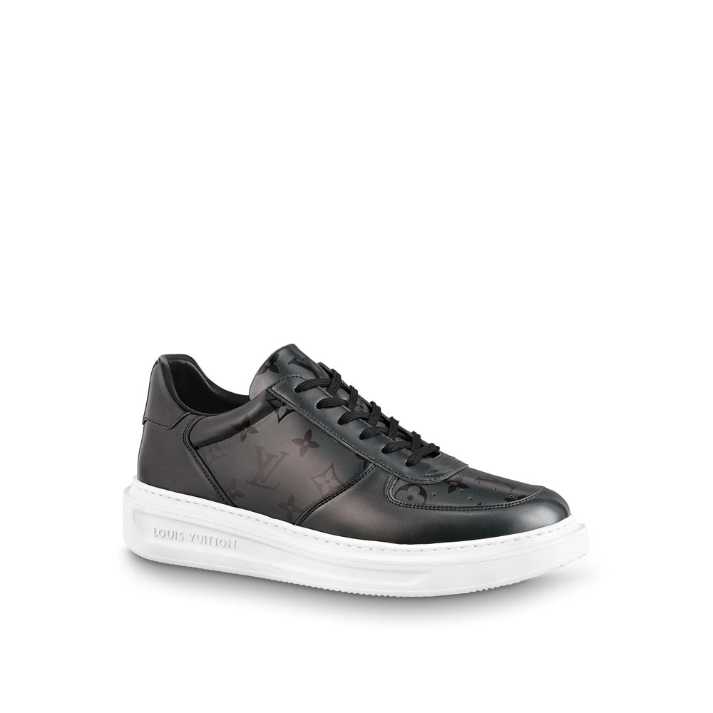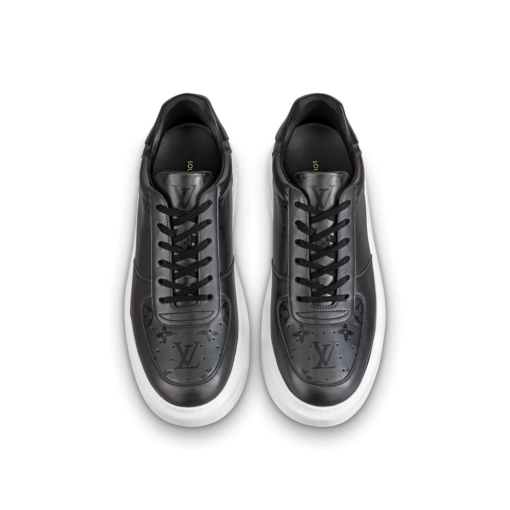 The Beverly Hills sneaker comes in metallic Monogram canvas. reflecting a key theme of the season's men's collection. This model's elegant upper contrasts with its sporty outsole in ultra-light. white rubber. The Louis Vuitton signature is printed at the back of the shoe and debossed on the outsole.
