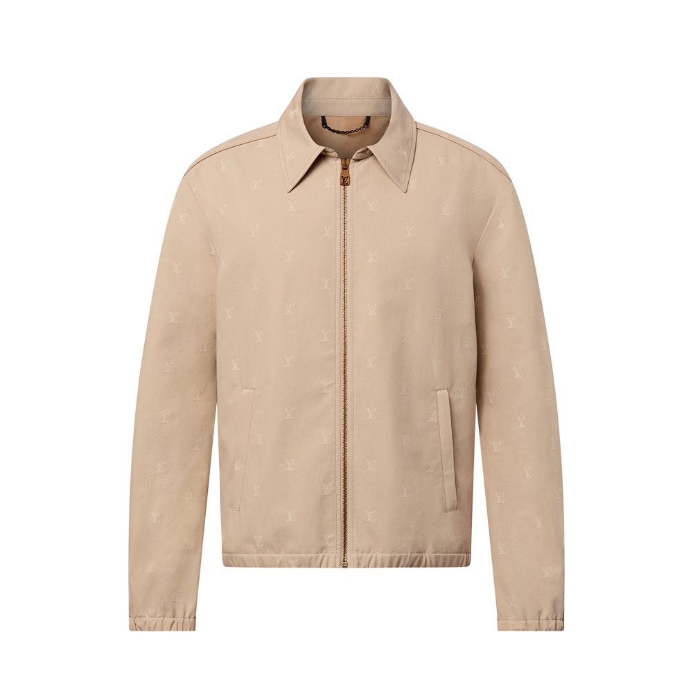 Louis Vuitton Blason Cotton Jacquard Blouson in Beige effortlessly elevates men's casual wear. Pair this airy, neutral-toned jacket with a crisp white crewneck tee and slim-fit dark denim jeans for a relaxed daytime look. The jacquard weave and iconic LV emblem harmonize with minimalist styles, allowing the louis vuitton cloth material to shine as a statement piece.