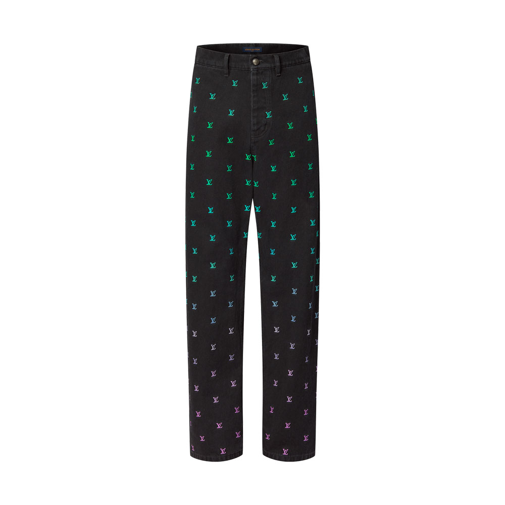 Style the Louis Vuitton Blason Skate Trousers with bold yet balanced ensembles. Pair these gradient-embroidered black denim pants with a crisp white LV logo tee for street-ready contrast. Layer with a black leather bomber jacket matching the trousers' base color while letting the aqua-to-violet embroidery shine.