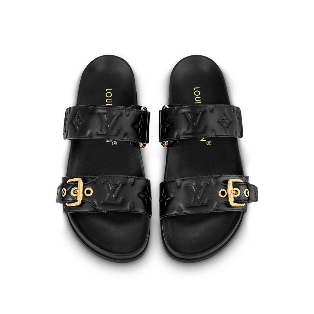 The Bom Dia flat comfort mule is revisited in extremely soft lambskin debossed with the Monogram pattern. This effortlessly cool style has two adjustable straps: one with velcro. the other with a Louis Vuitton-engraved. gold-tone buckle. An anatomic insole and lightweight. slip-resistant rubber outsole make this model particularly pleasant to wear.