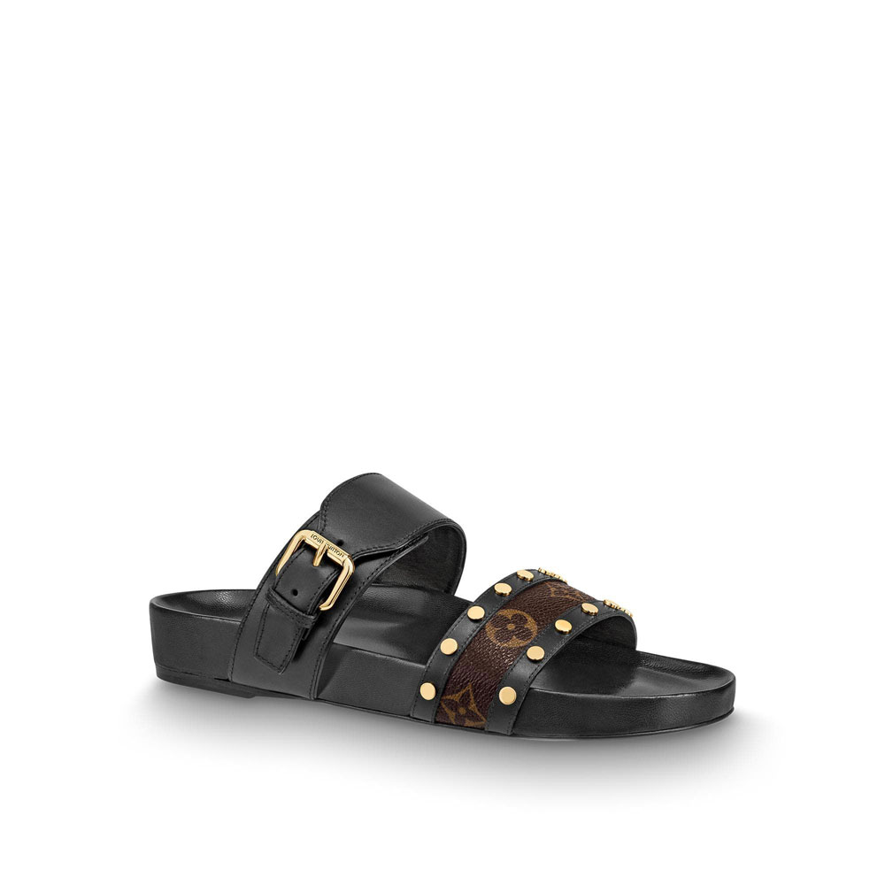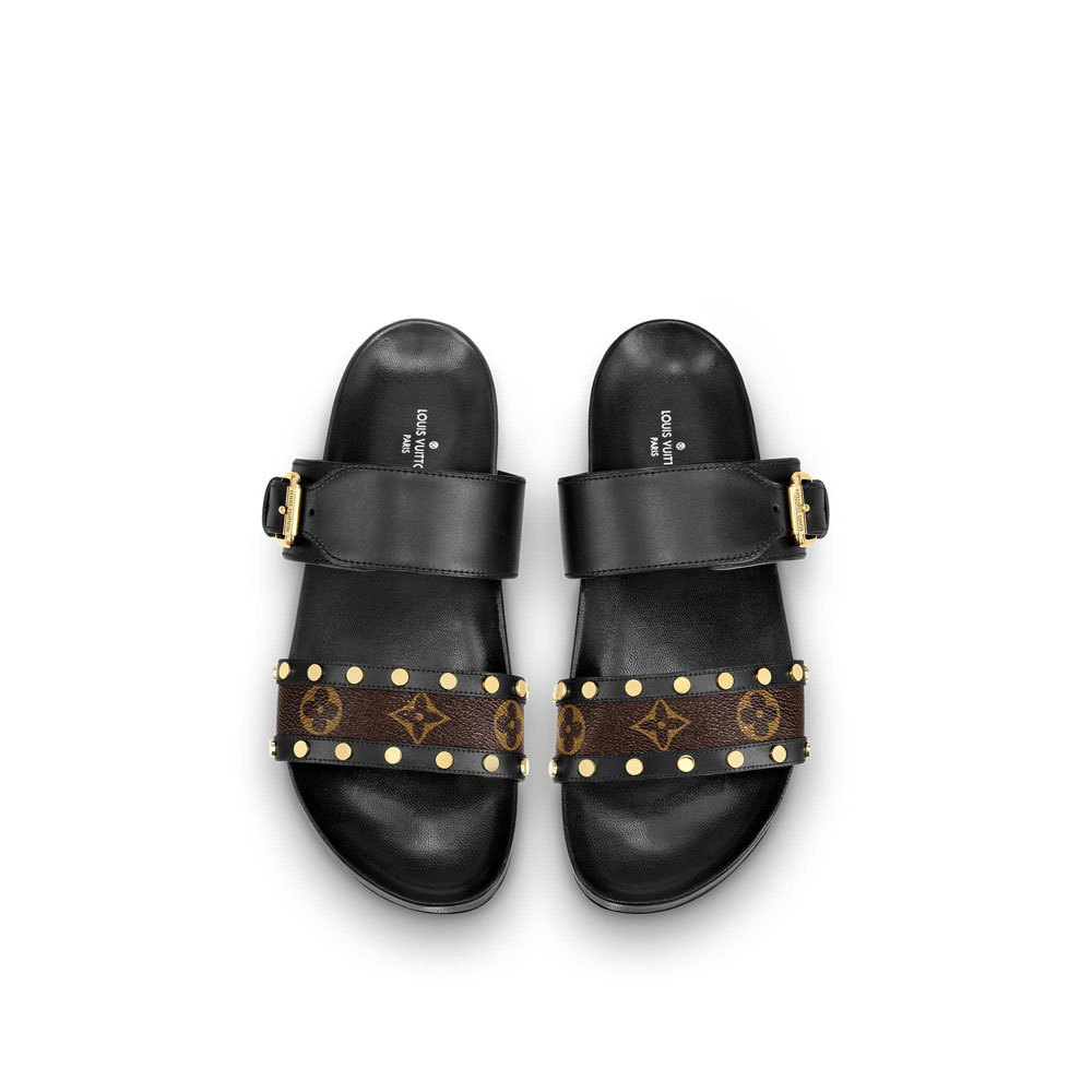 The Bom Dia flat mule is revisited this season in black calf leather and patent Monogram canvas. The double row of gold-tone studs on the wide front strap was inspired by historic Louis Vuitton trunks. This comfort sandal features a padded anatomic footbed.
