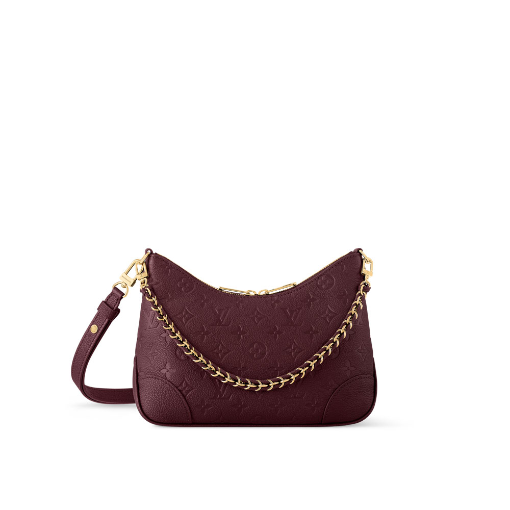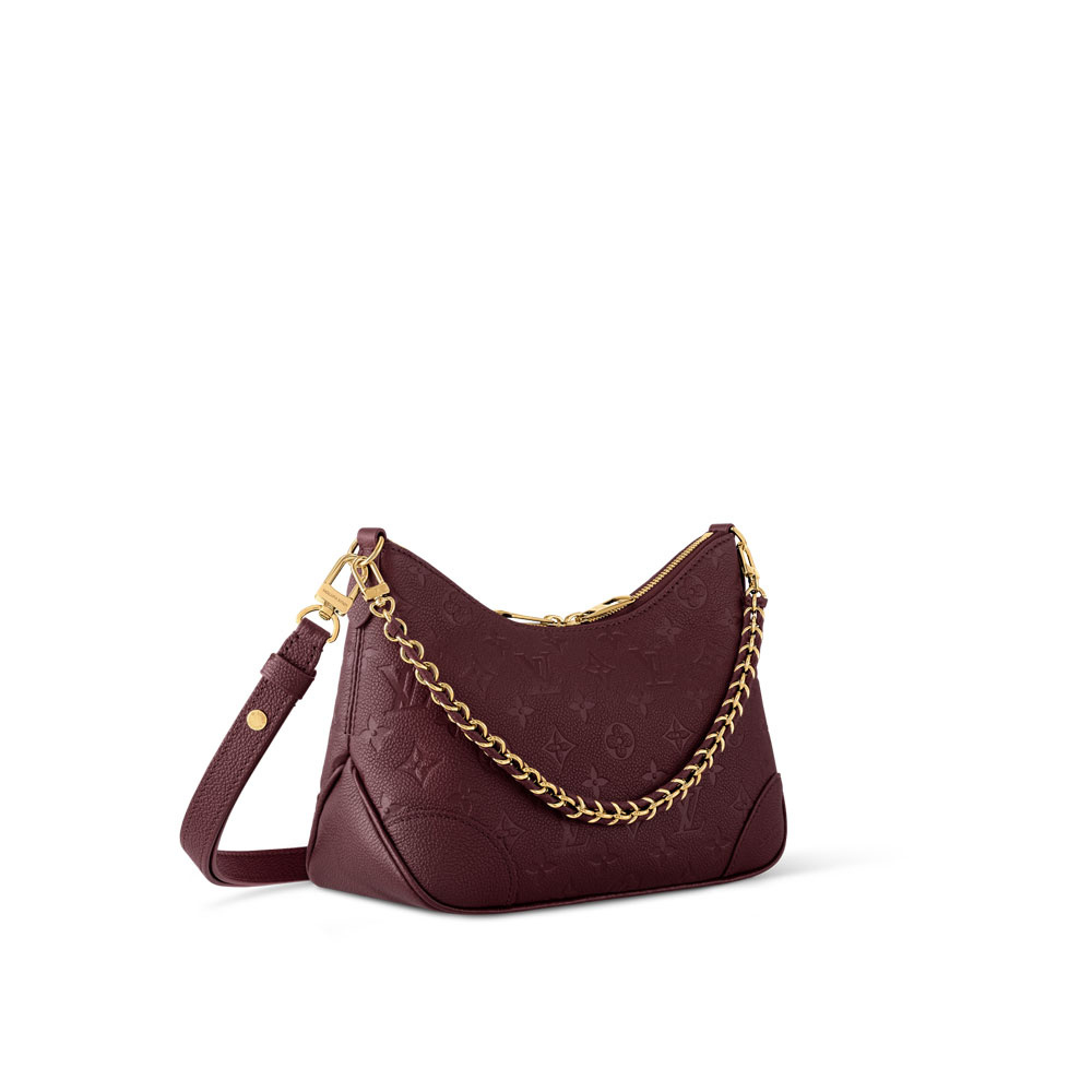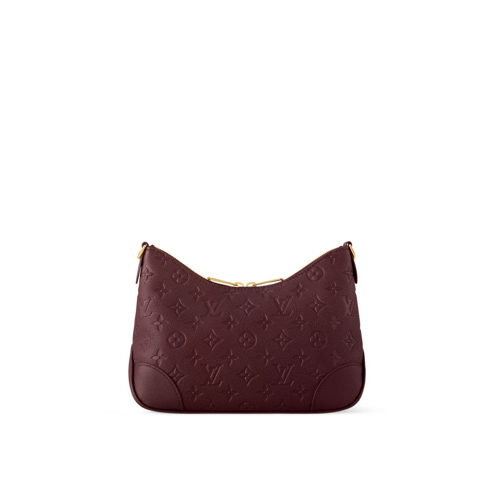 The Louis Vuitton Boulogne PM shoulder bag in deep red monogram empreinte leather offers versatile styling options for any fashionable wardrobe.