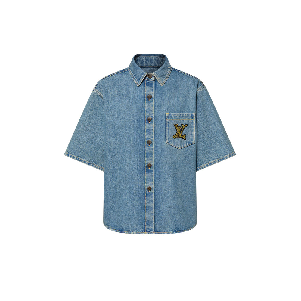 Louis Vuitton Boxy Denim Shirt in Blue offers versatile styling for women. Pair it with white tailored trousers and strappy sandals for a polished daytime look, or layer over a graphic tank and high-waisted shorts for casual chic. The loose silhouette complements slim-fit skirts, while nautical accents harmonize with striped midi dresses.