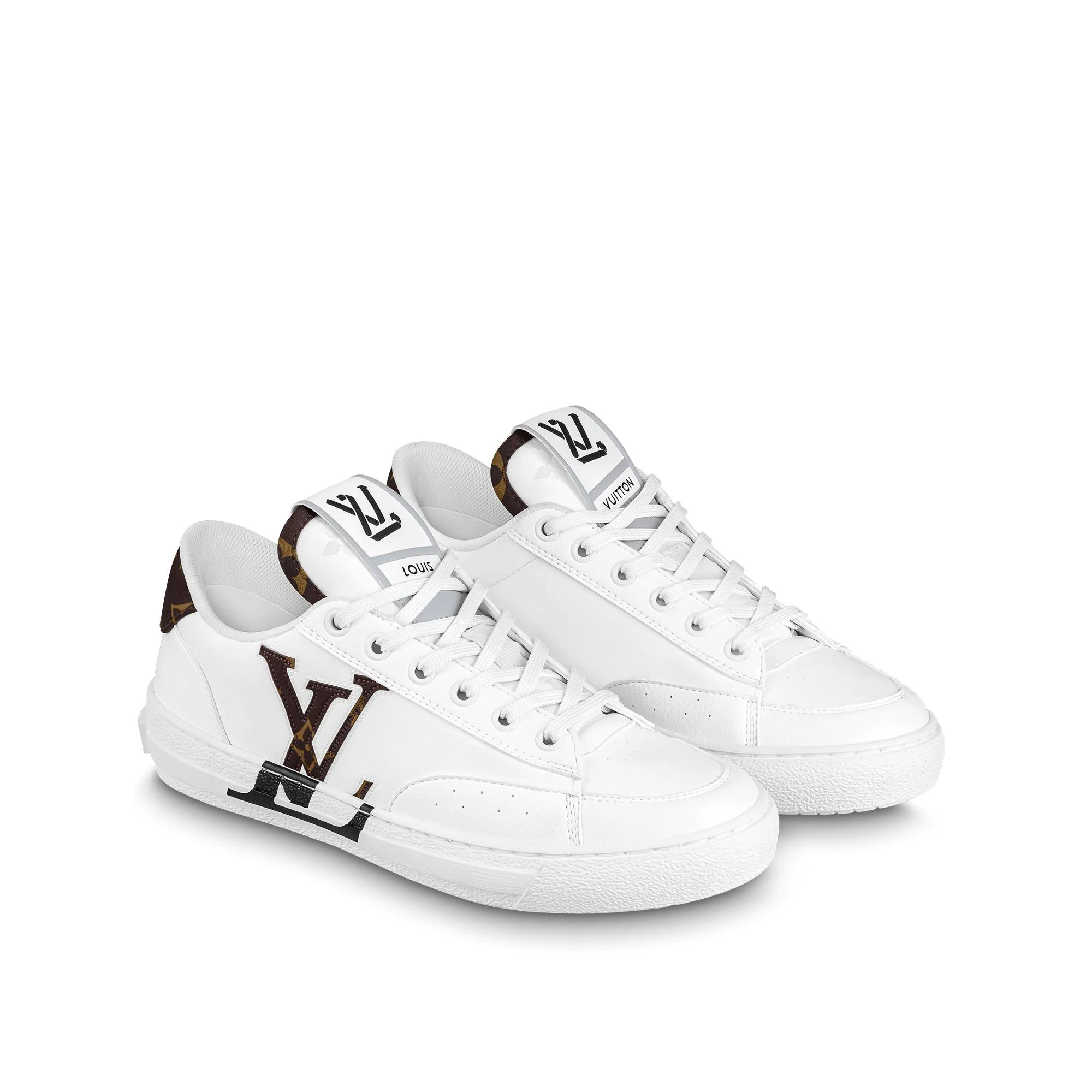 The eco-designed Charlie sneaker. crafted from 90% sustainable materials. is revisited in an all-white version accented with Monogram signatures. These include Monogram textile trim made with recycled polyester on the back. and an embroidered LV Initials logo on the side. The outsole. made from recycled rubber. features the Louis Vuitton signature.