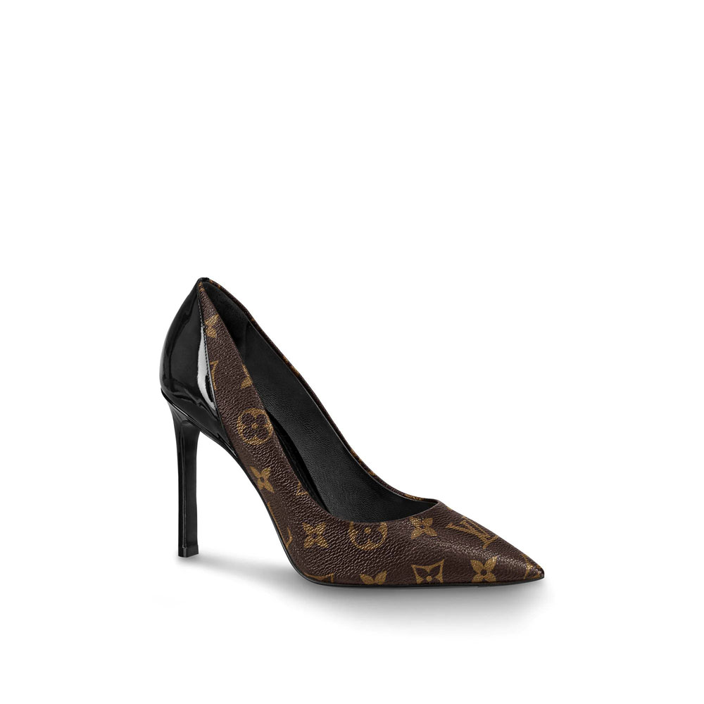 With its sleek lines. stiletto heel and pointed toe. the Cherie pump is a timelessly feminine style. which is given a fresh twist by the combination of black patent calf leather and Louis Vuitton's iconic Monogram canvas. A rubber insert on the leather outsole ensures enhanced resistance to wear.