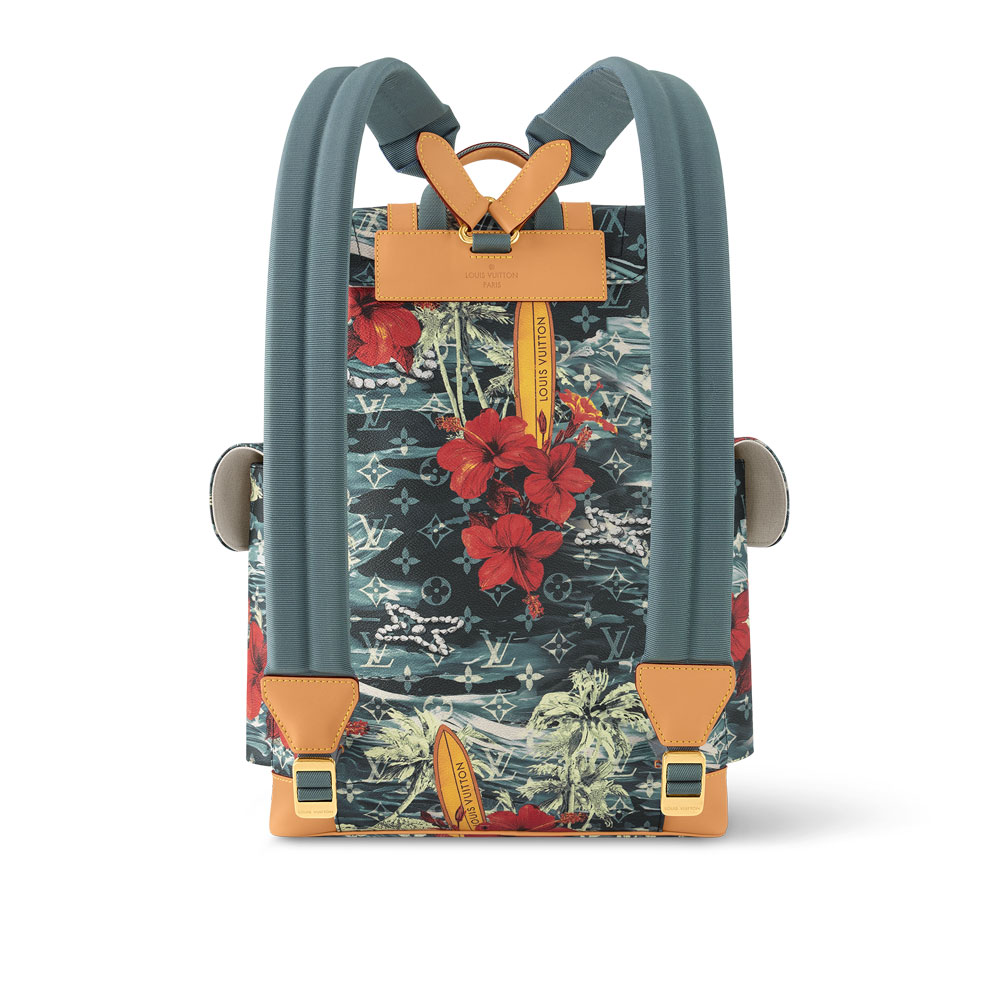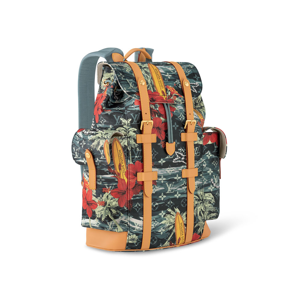 Inspired by the classic rucksack, the Christopher MM backpack is made from Pharrell Williams Monogram Surfin canvas. The print on the canvas combines layers of elaborate motifs, including surfboards and flowers, for a colourful vintage feel. This body-friendly, high-capacity backpack offers an array of compartments, including two outside side pockets.