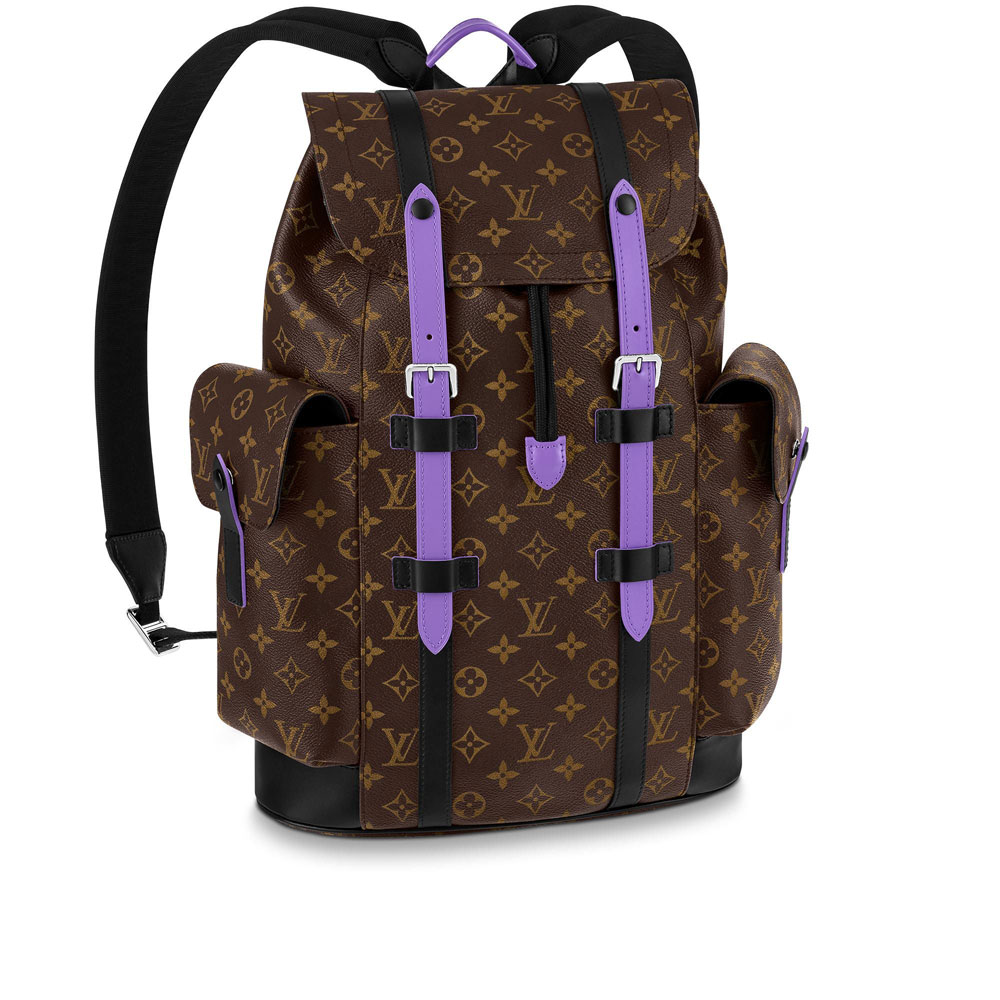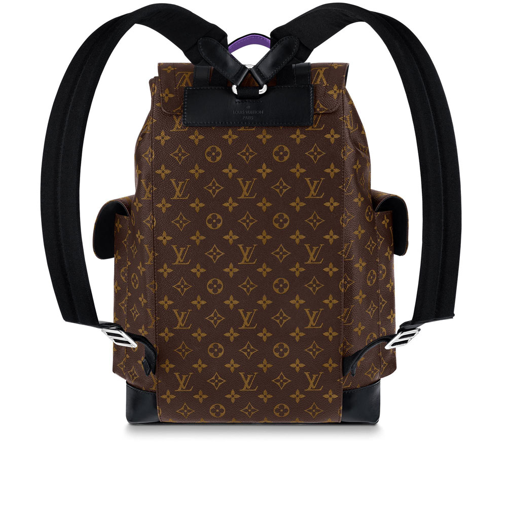 Blending urban elegance with the rugged spirit of a hiking pack. this version of the Christopher Backpack is crafted in Monogram Macassar canvas with cowhide trim dyed a bold shade of purple. one of designer Virgil Abloh's signature colors. With two side pockets and a special tablet computer compartment. it's a functional and fashionable carry-all.