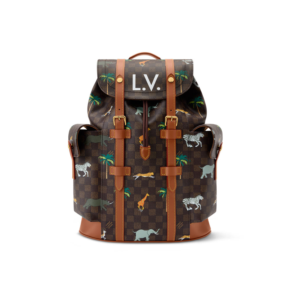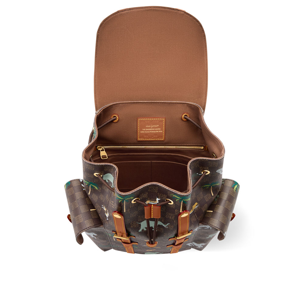 This limited-edition men's backpack features rugged Damier Heritage canvas with a unique animal print design, inspired by The Darjeeling Limited collection. The dark brown color scheme is enhanced with genuine leather accents.