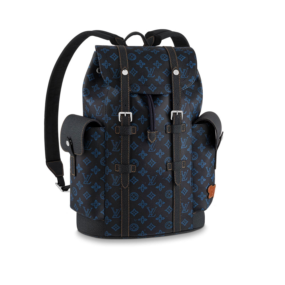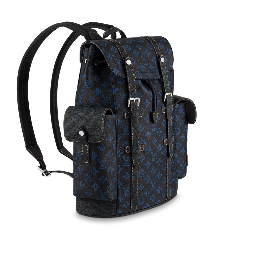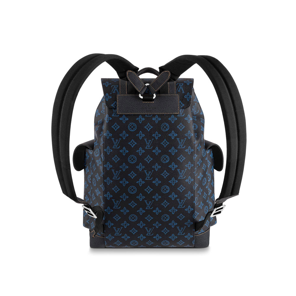The Christopher MM backpack is made from coated canvas with a pattern of blue Monogram Flowers and LVs on a dark background. The trim in black leather. with contrasting stitching. and the LV initials leather patch emphasize the bag's rugged design. Side pockets and an inside iPad pocket make this a functional and fashionable carry-all.
