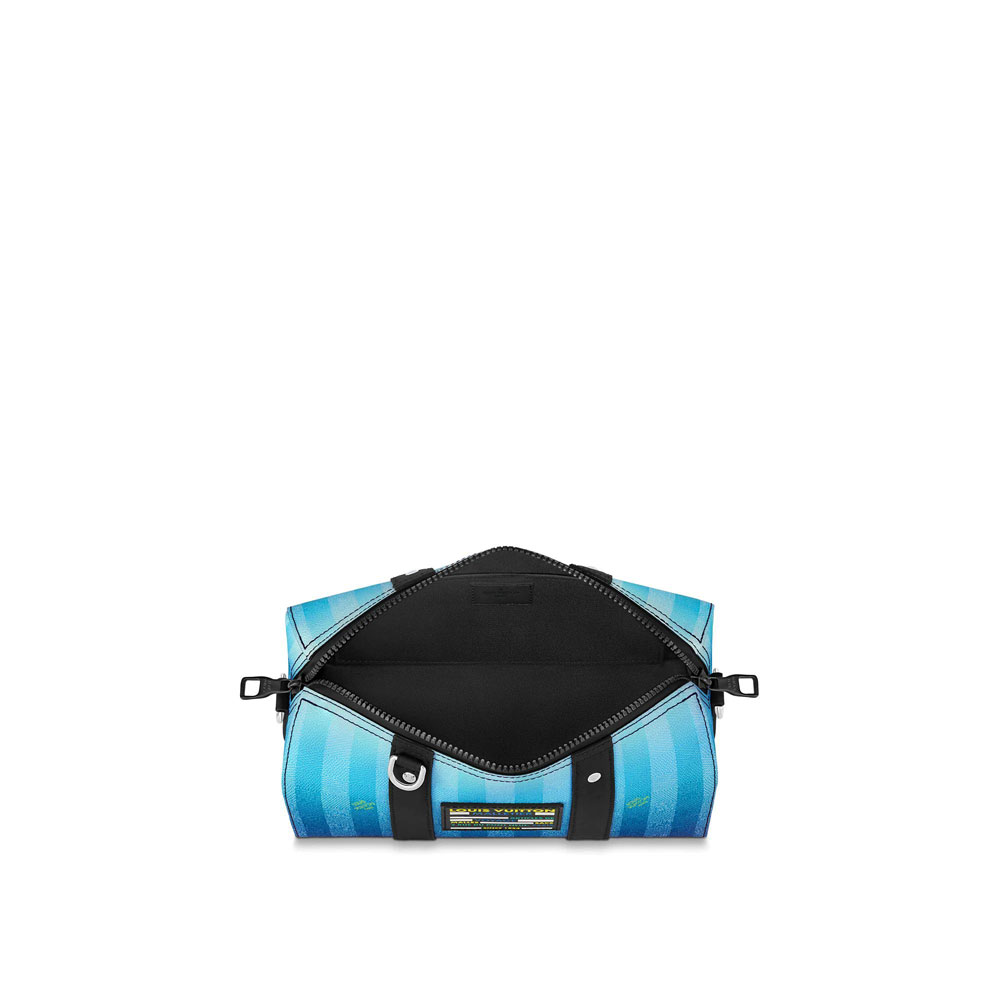 A striking gradient of blue stripes make this City Keepall bag impossible to miss. Made from Damier Stripes canvas with black-leather trim and shoulder strap. it features a black-leather Louis Vuitton patch. inspired by the lettering on the House's traditional delivery trucks. and a removable black plastic name tag.