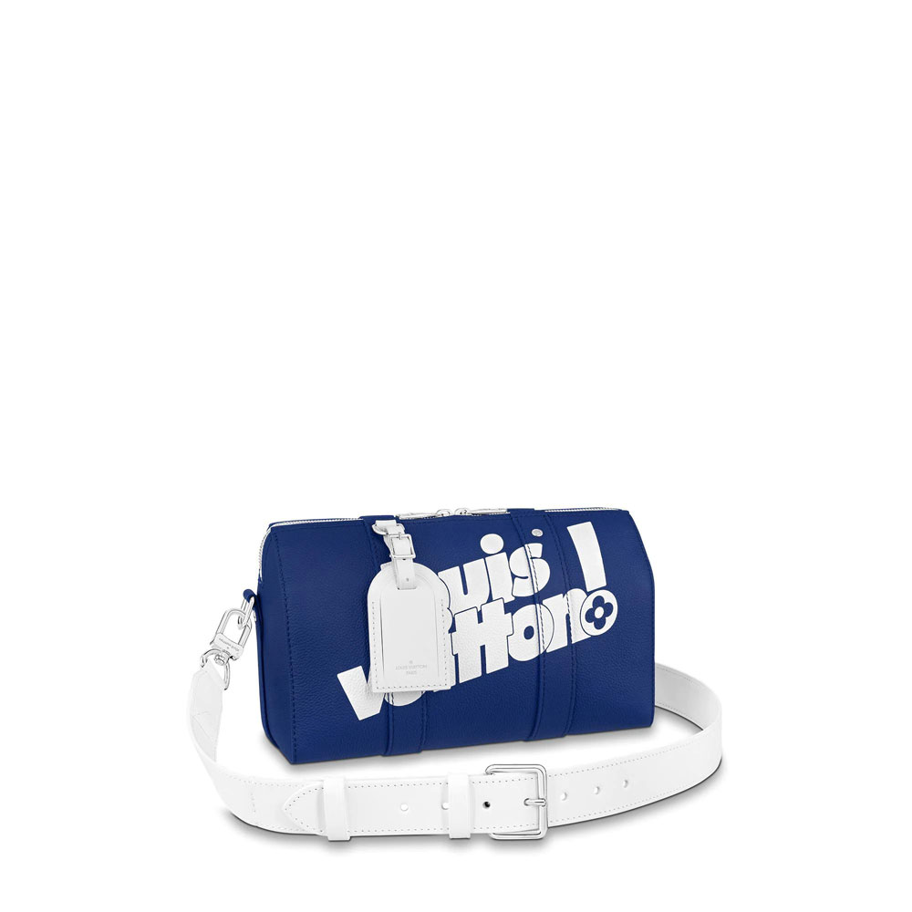 A compact version of the House's iconic Keepall bag from 1930s. the City Keepall is perfect for transporting daily essentials. Made from blue cowhide leather with a big print of louis vuitton! on the front in white. this carryall was included in Virgil Abloh' Everyday LV capsule for the Fall-Winter 2021-22 Collection.