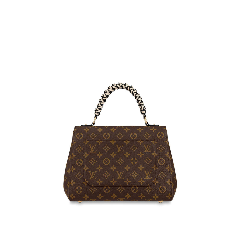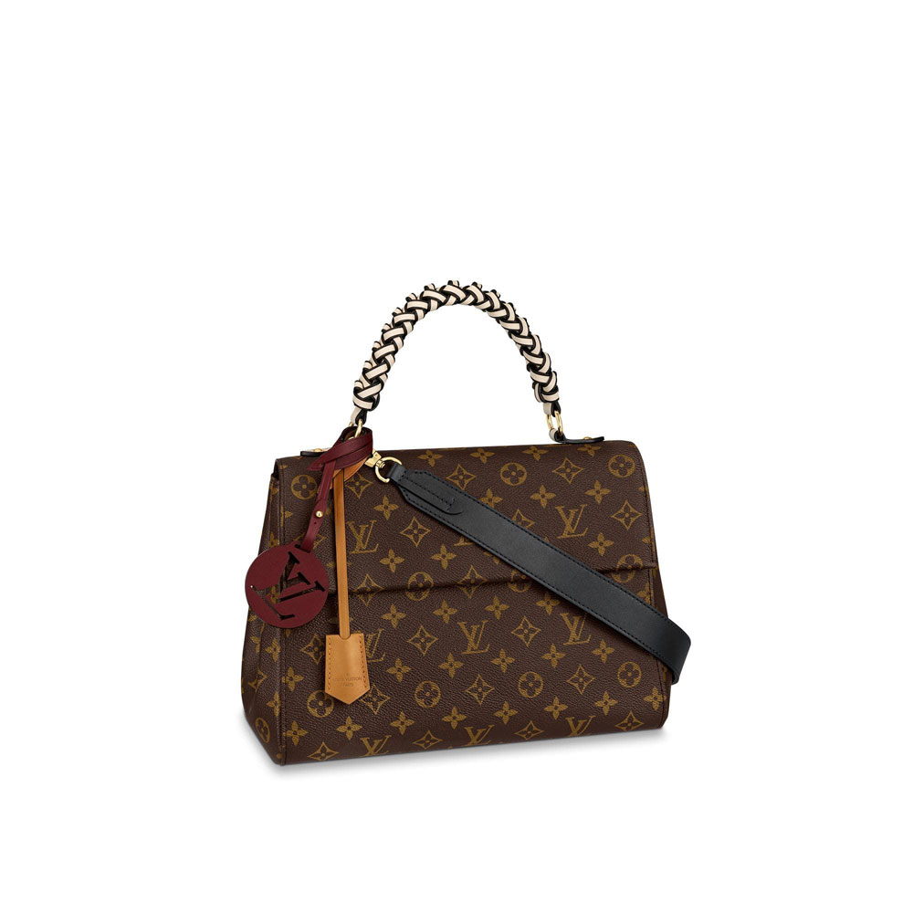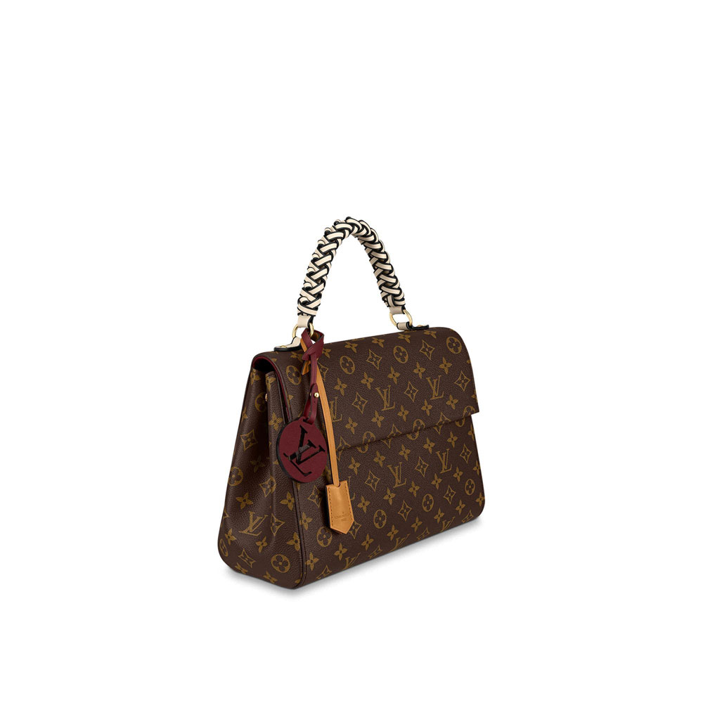 With its top handle in braided leather. the Cluny MM handbag in Monogram canvas is a study in elegance. The navy blue removable leather strap and oversized leather LV charm bring a sense of fun to the bag's structured lines. The magnetic flap closure keeps personal effects secure in the well-organized interior.