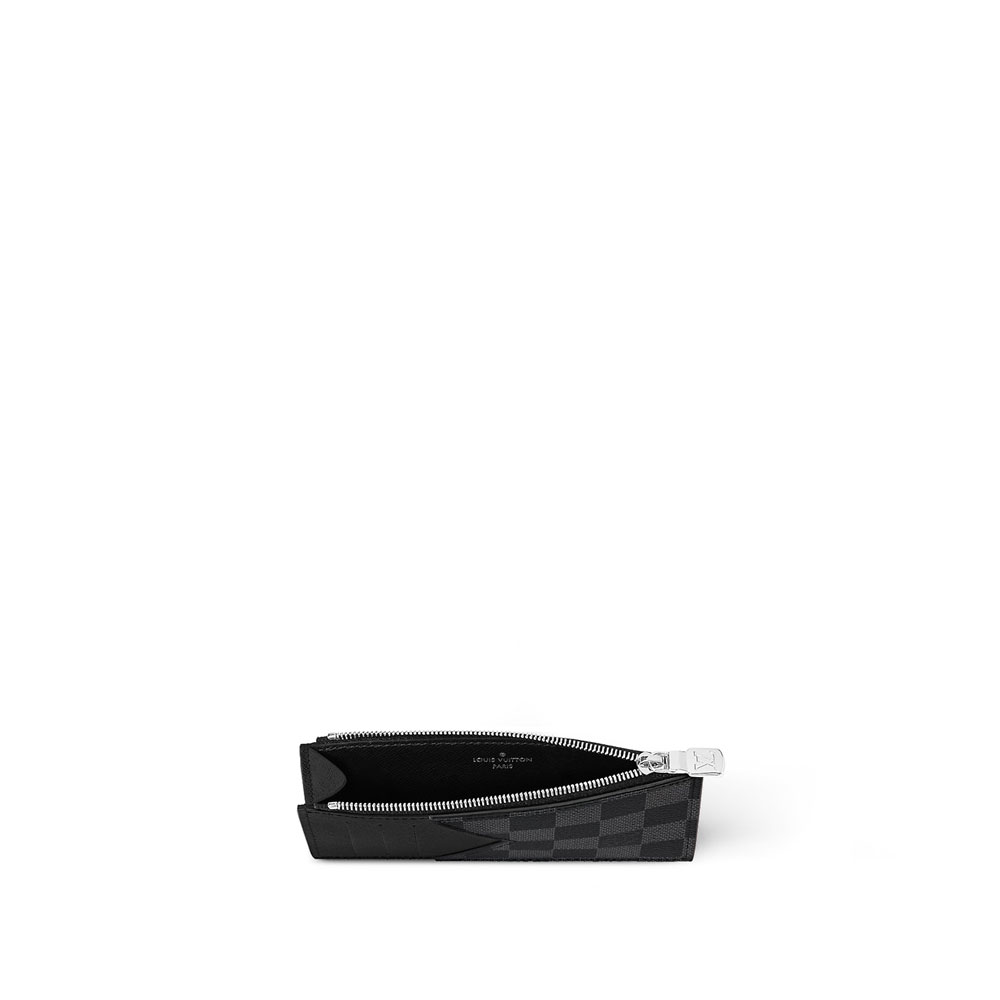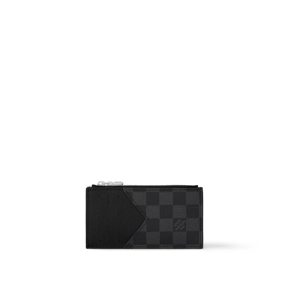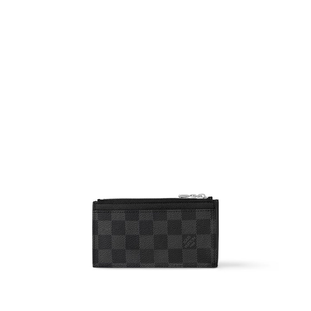 The Coin Card Holder in Damier Graphite canvas is the ideal solution to keep payment essentials in one safe place. Its neat, slim-line design features credit card slots, a zipped coin pocket and a compartment for banknotes.The black leather lining coordinates stylishly with the black and gray canvas. Size:8 x 14.5 x 1CM
