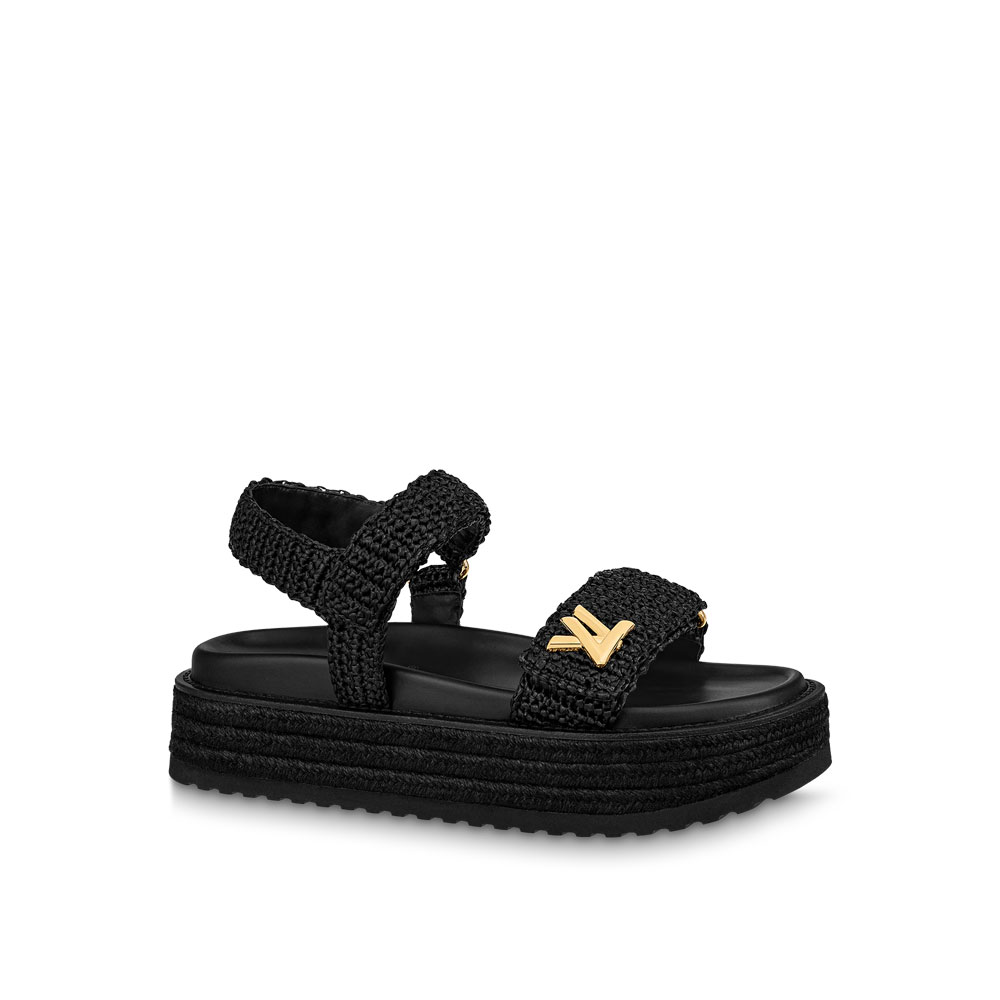 The Cordoba flatform comfort sandal is distinguished by its upper in raffia and its platform in braided rope. which give it a refined. artisanal feel. This model has two adjustable velcro straps. one of which is decorated with a gold-tone LV accessory inspired by the Twist bag. A rubber outsole finishes this on-trend. easy-to-wear style.