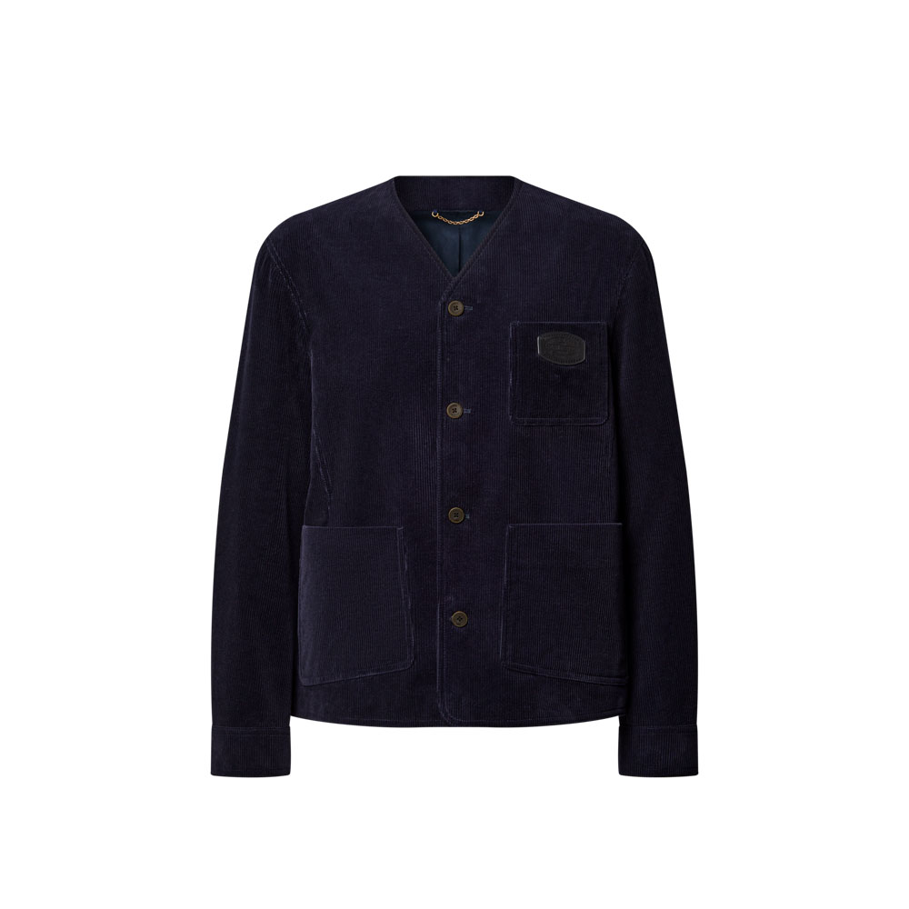 This refined midnight blue jacket draws inspiration from British countryside aesthetics. Crafted from thick-ribbed corduroy, it features a collarless V-neck and subtle workwear influences.