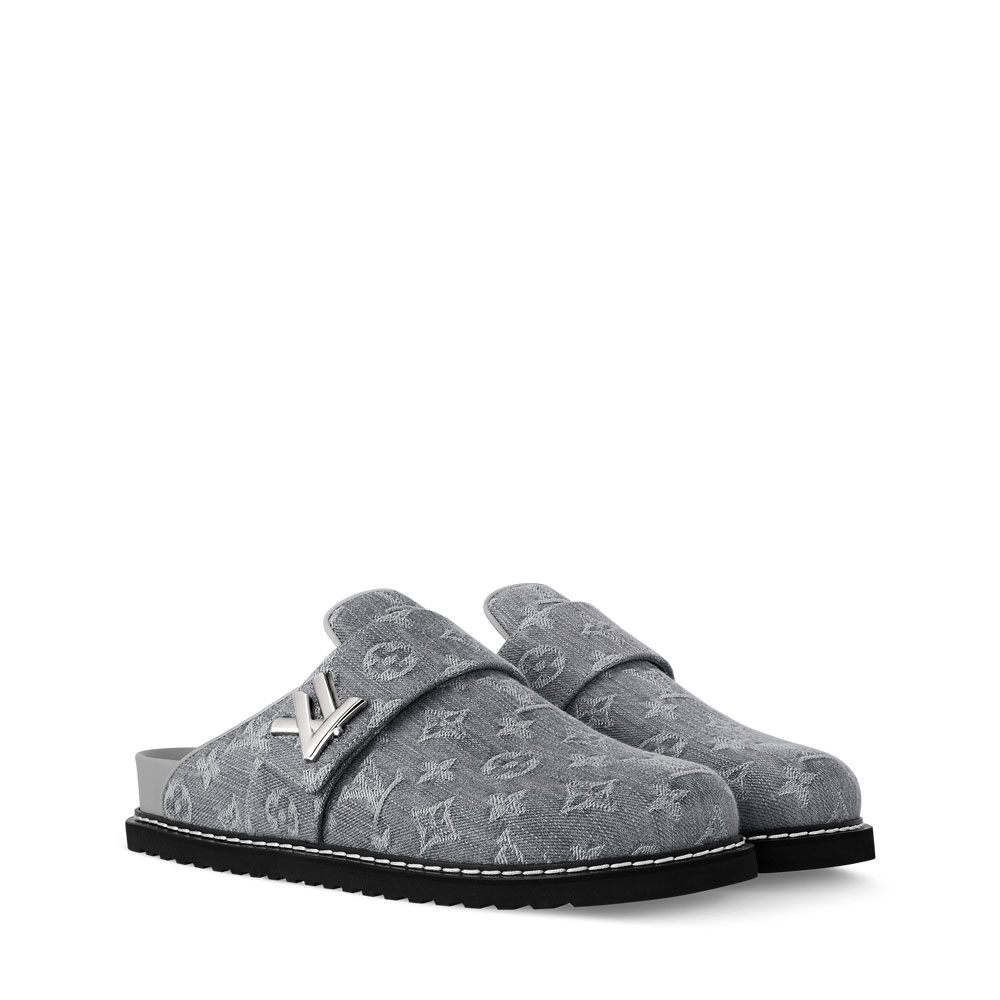 Experience ultimate relaxation with Louis Vuitton's LV Cosy Comfort Mule. This stylish slip-on features Monogram denim and elegant leather accents, including signature LV Twist hardware on the adjustable strap.