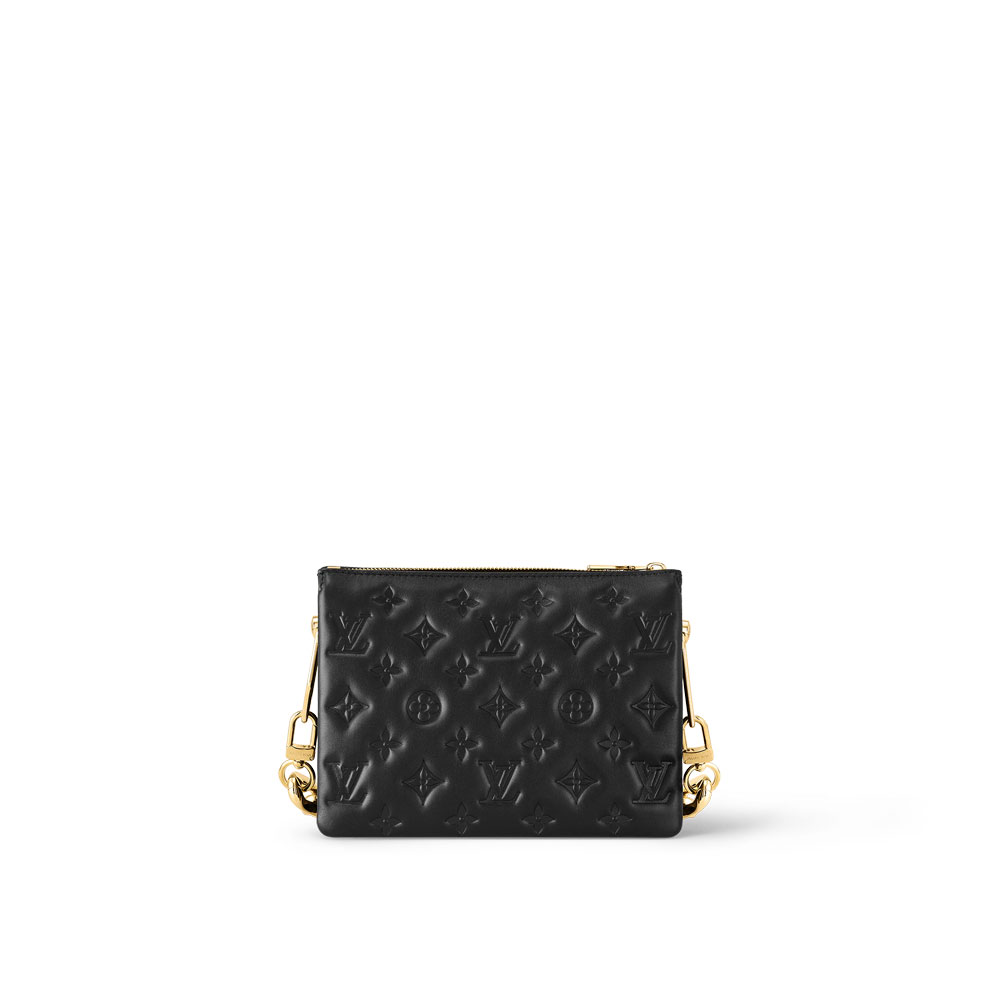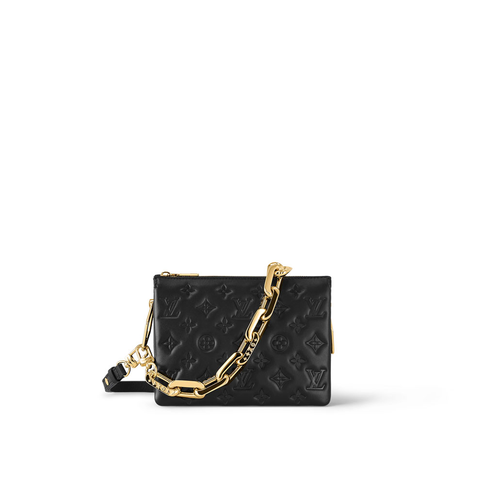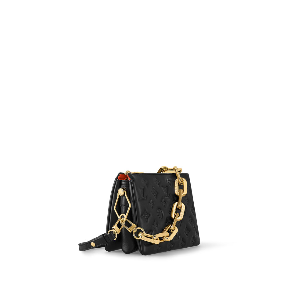 The super soft and cushiony Coussin BB is an adorably compact handbag. fashioned from puffy lambskin embossed with the Monogram pattern. A chunky gold-color chain and a thin leather strap. both removable. enable different attitudes and carry options. Two inside compartments add practicality. making this an ideal day-to-evening accessory.