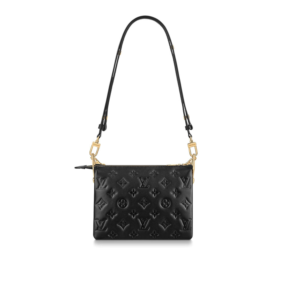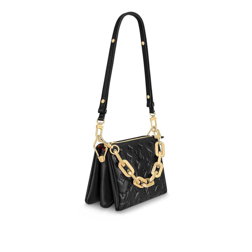 The super soft and cushiony Coussin BB is an adorably compact handbag. Fashioned from puffy lambskin embossed with the Monogram pattern. A chunky gold-color chain and a thin leather strap. Both removable. Enable different attitudes and carry options. Two inside compartments add practicality. Making this an ideal day-to-evening accessory.
