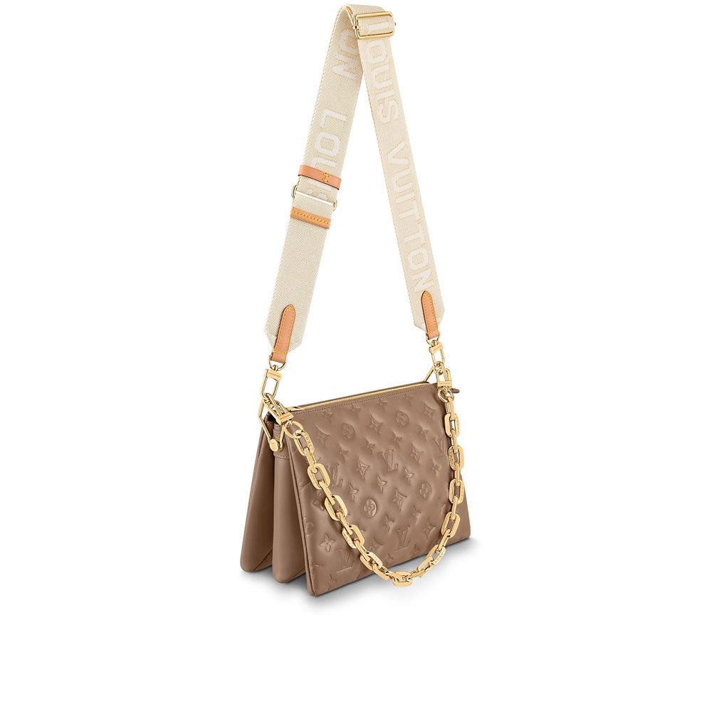 Fashioned from puffy lambskin and accessorized with a chunky gold-color chain. this Coussin PM handbag is part of the Fall-Winter 2021 Collection. Its bright vibrant colorway is Nicolas Ghesquiere's translation of the joy and audacity of women. The Coussin can be worn cross-body with the strap. as a chain baguette. or carried under the arm.