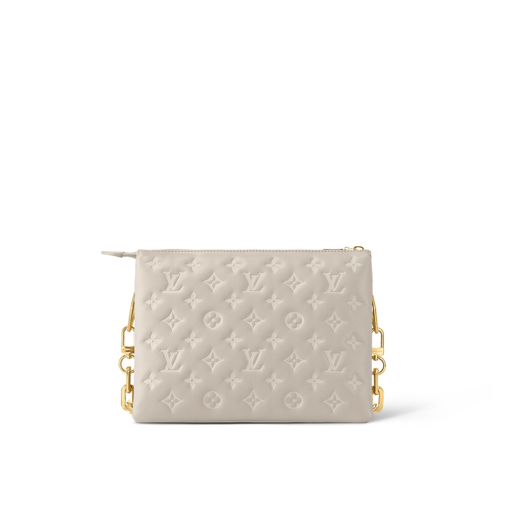 Made from puffy lambskin embossed with the Monogram pattern. the eye-catching Coussin PM handbag now comes in elegant grey with a gold-color chunky chain. Its pillow-like shape encloses three distinct inside compartments. The supple Coussin can be worn on the shoulder or cross-body. with its wide detachable strap. or under the arm. thanks to the chain.