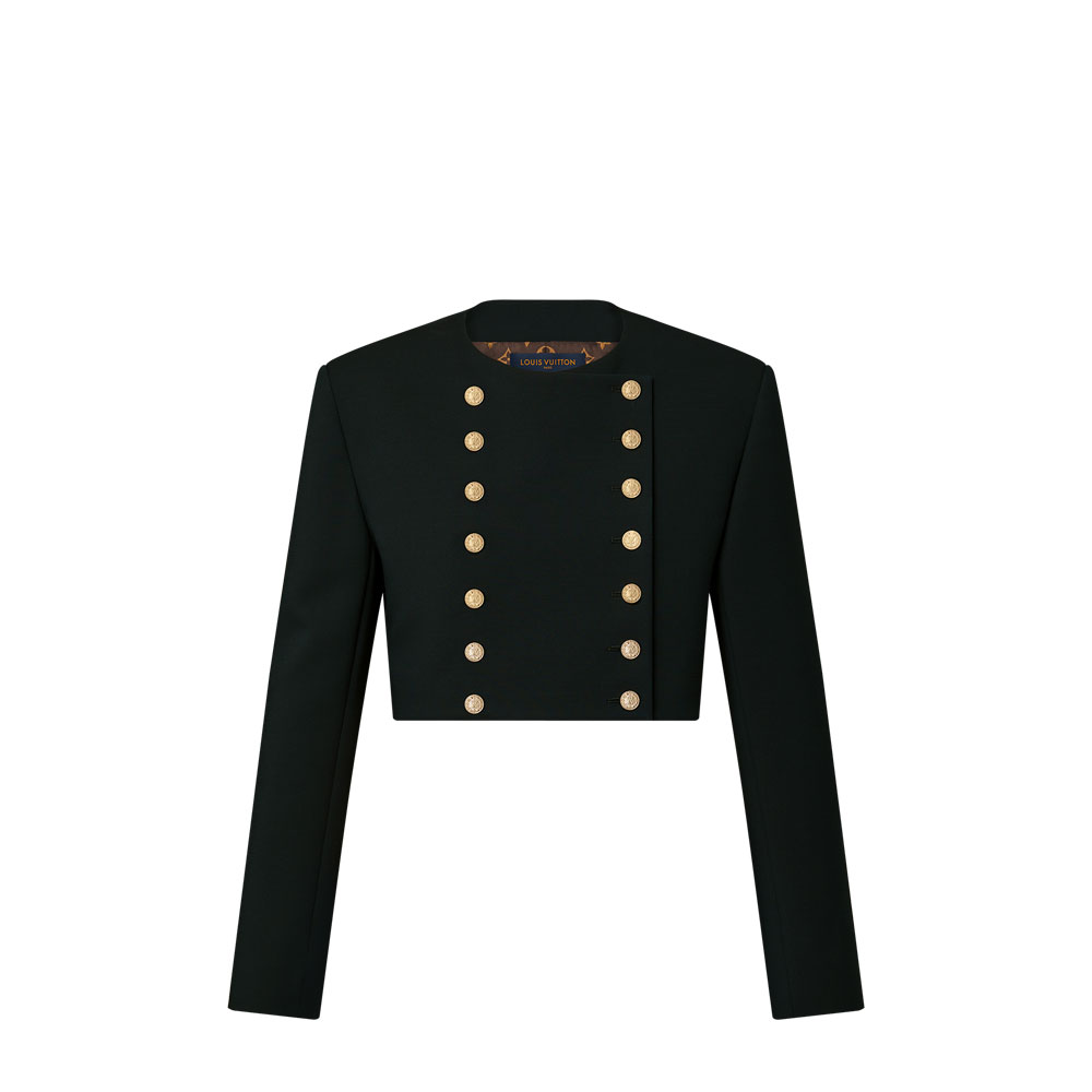 High-waisted tailored trousers or a leather pencil skirt accentuate the jacket's cropped silhouette, while strappy heels or ankle boots add contemporary edge. Highlight the gold-tone LV buttons by accessorizing with minimalist gold jewelry.