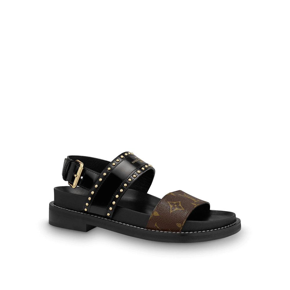 The Crossroads comfort sandal combines black glazed calf leather with iconic Monogram canvas. This on-trend style features refined details. including rows of gold-tone studs and a gold-embossed Louis Vuitton signature on the strap. The leather-covered anatomic footbed and adjustable back strap ensure optimum comfort.