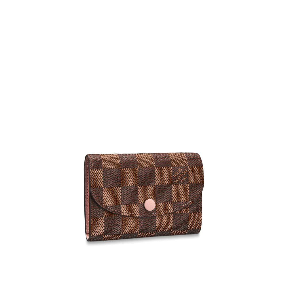 Combining Damier Ebene canvas with colorful grained cowhide leather. the Rosalie coin purse is a sweet. feminine design. Its tiny proportions allow it to slip easily into a bag or pocket. yet it is surprisingly spacious. Its distinctive rounded flap is secured with a color-matched press-stud.
