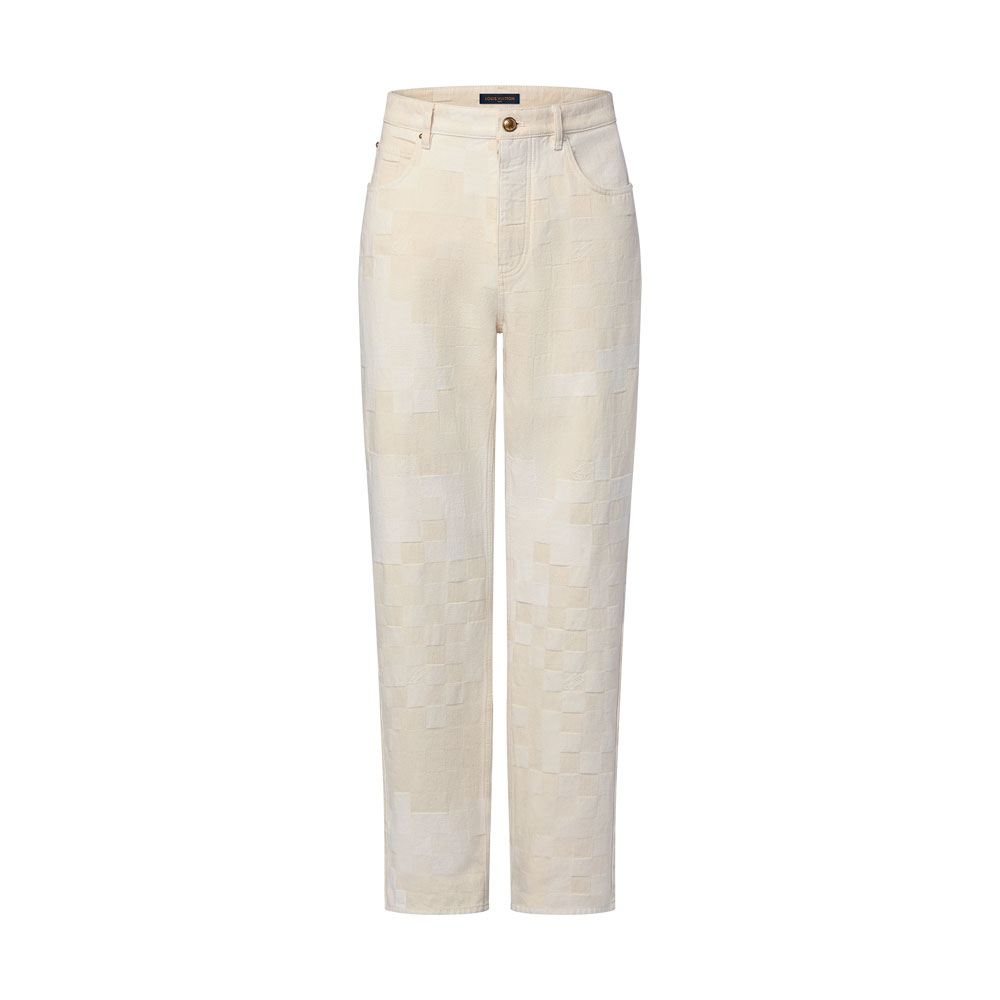Pair these timeless beige skate trousers with a crisp white cotton tee for a relaxed, warm-weather look. The tonal jacquard weaving and subtle L.Vuitton motifs elevate the jeans, making them ideal for layering with a lightweight linen blazer in sand or navy for smart-casual occasions. Footwear options range from Louis Vuitton's own Archlight sneakers to minimalist leather slides.