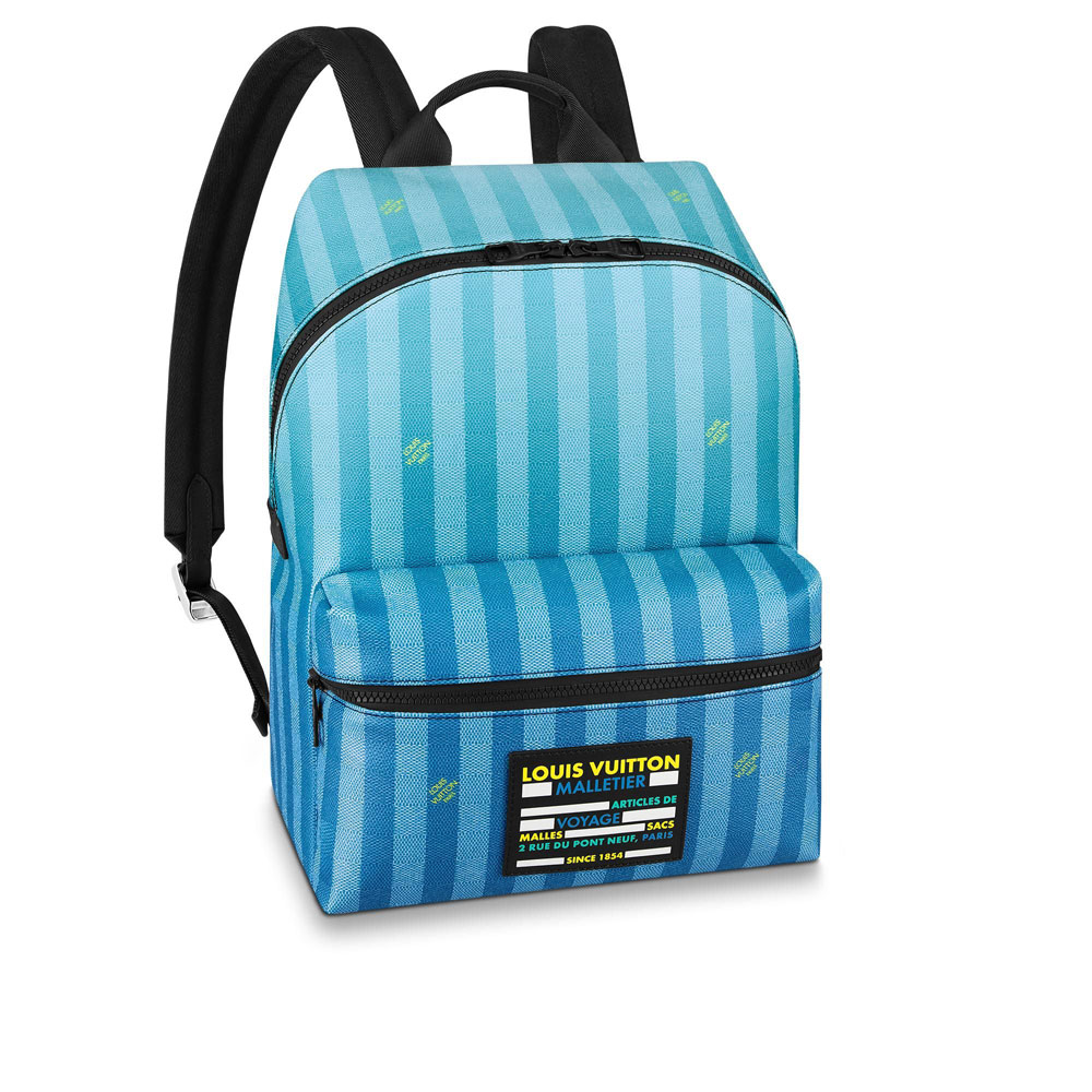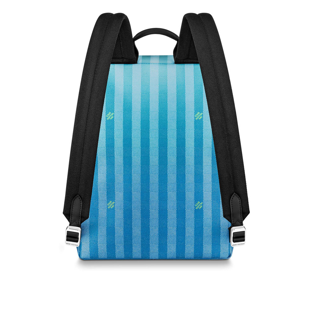 The Discovery Backpack looks fresh in the gradient blues of Damier Stripes canvas. a reimagining of the stripes found on vintage Louis Vuitton trunks. The fading stripes. together with the new leather patch. inspired by the signage on the sides of Louis Vuitton historic trucks. bring a contemporary feel to this backpack's boxy shape.