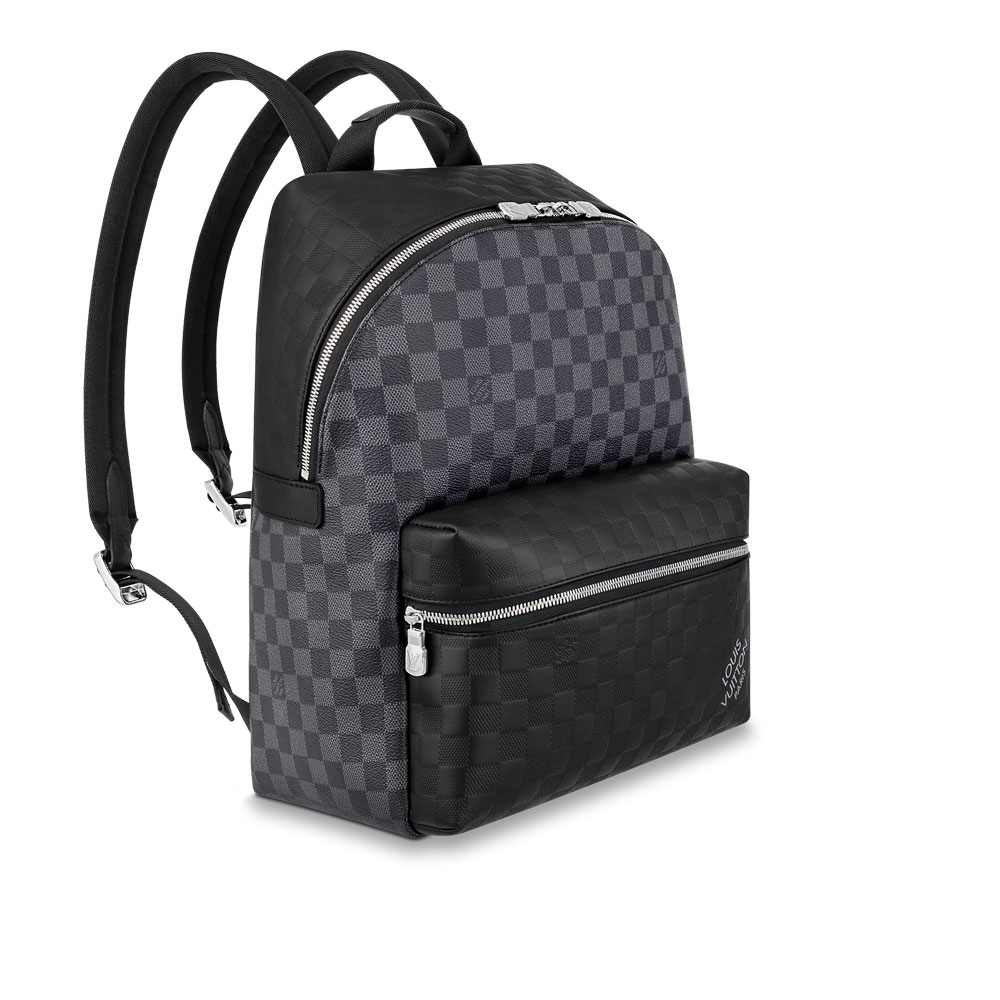 Part of the Damier capsule. This stylishly practical Discovery Backpack PM is made from a combination of Damier Infini leather and Damier Graphite canvas. The oblique Louis Vuitton signature on the lower corner is inspired by the emblematic logo on the Damier pattern. Enriched with an embossed effect.