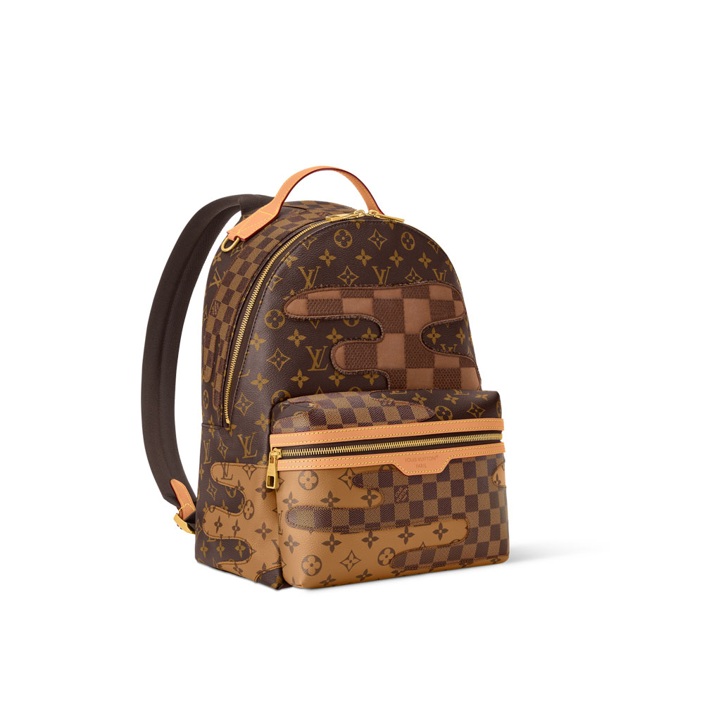 This stylish backpack combines multiple signature patterns, featuring a mix of Monogram and Damier canvas materials.