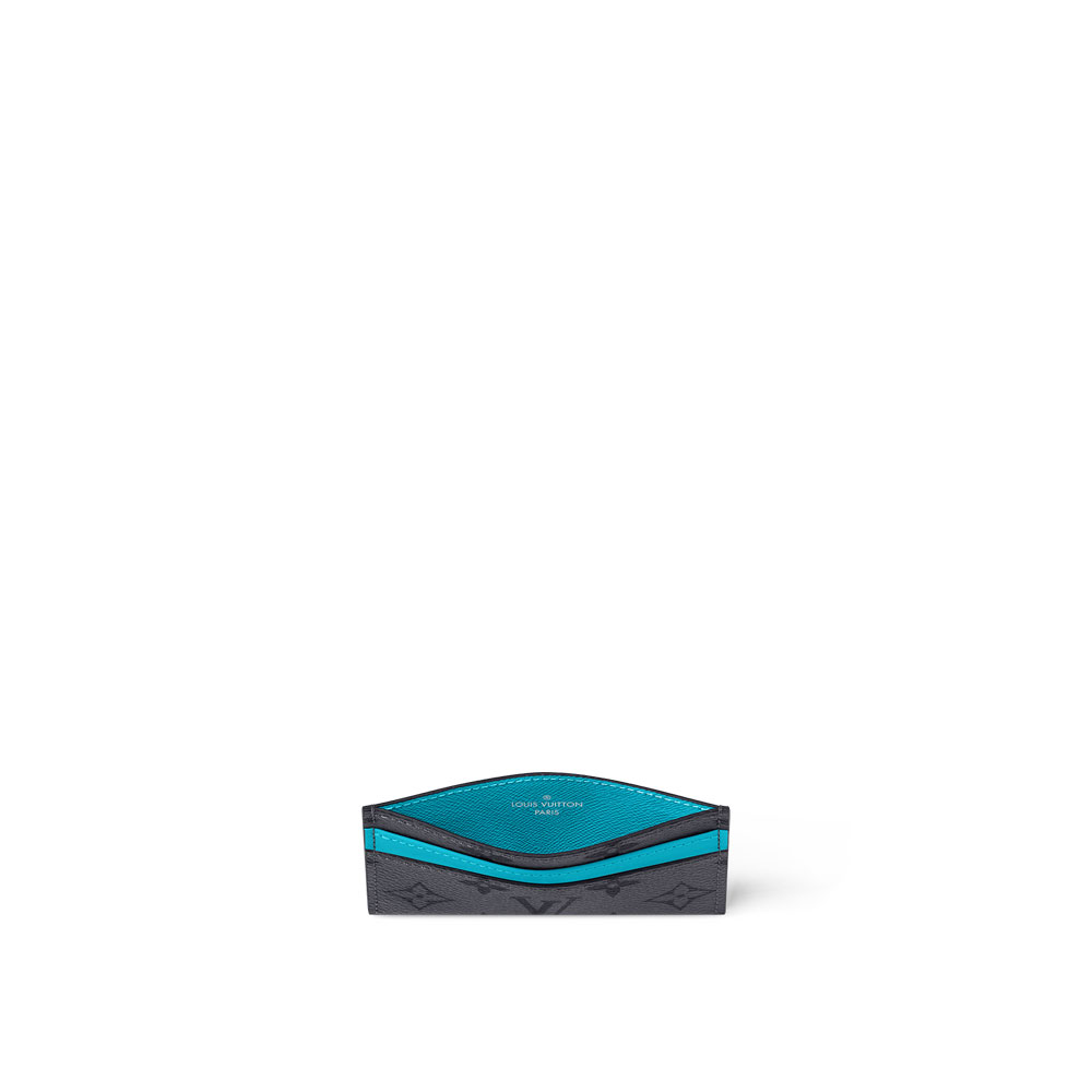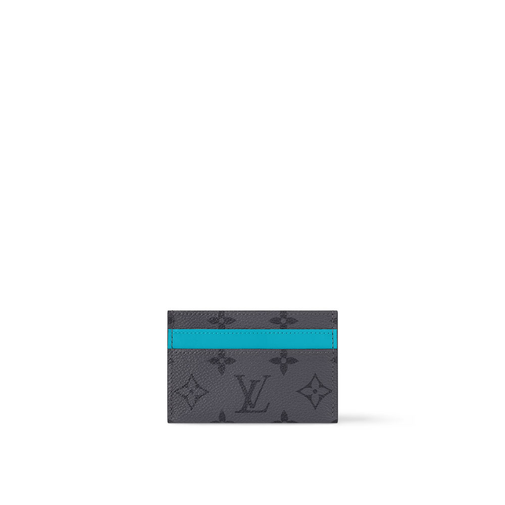 An exquisite piece, this Double Card Holder in Monogram Eclipse Reverse canvas features four slots for cards - credit, business or transport - and a central pocket for receipts or other small papers. The understated design is livened up with a band of turquoise leather along the top. The Double Card Holder fits into any pocket. Size:11 x 7 x 1.5CM