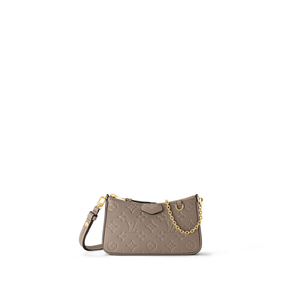 The Easy Pouch On Strap is made from Monogram Empreinte leather. The sleek design lends itself beautifully to the embossed Monogram pattern on the supple Empreinte leather. It can be worn on the shoulder, with the chain or the strap for a short carry, or cross-body as the leather strap is adjustable.