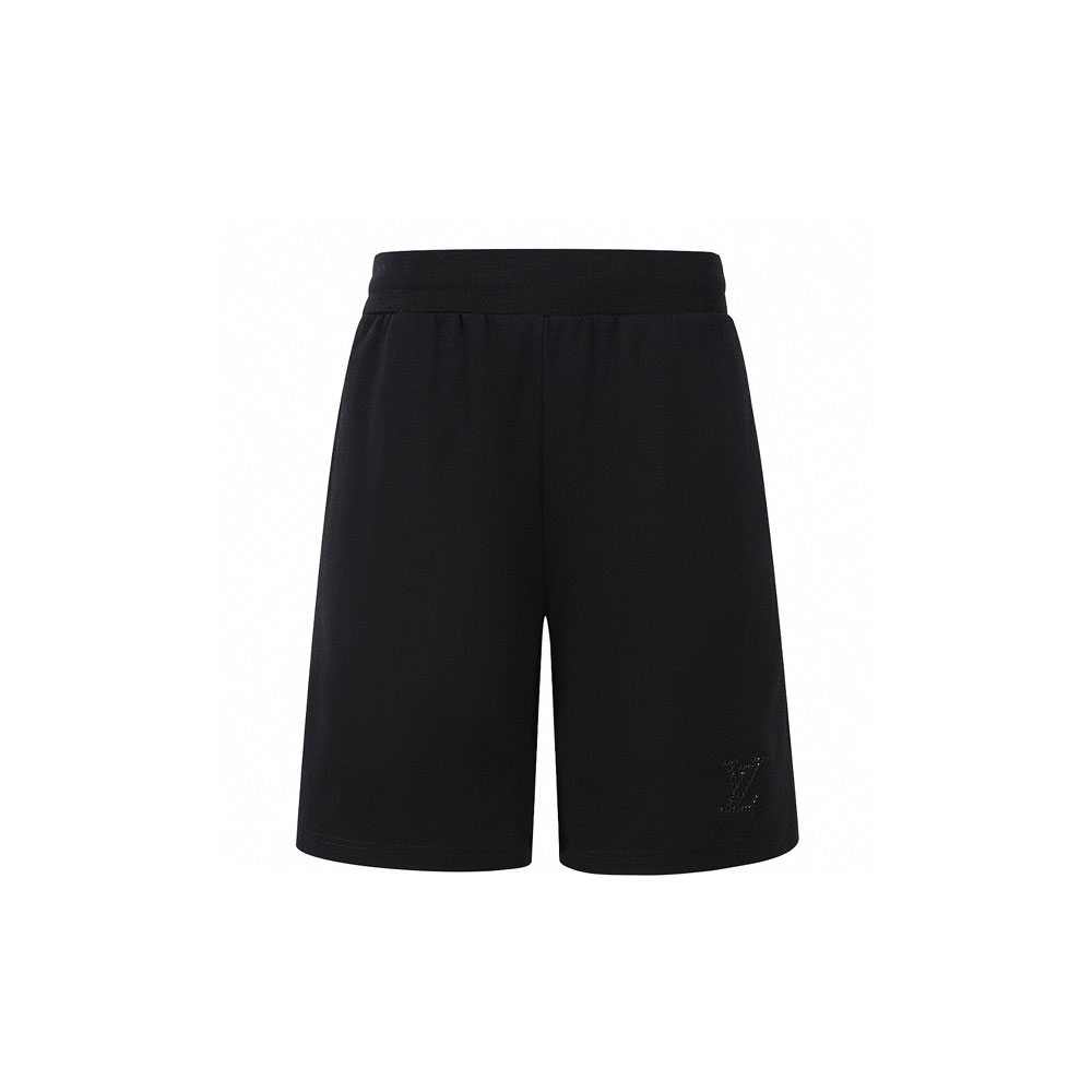 Pair these sleek black shorts with a crisp white graphic hoodie-like the Louis Vuitton Graphic Hoodie-for a casual luxe look. The rhinestone LV branding complements urban streetwear effortlessly.