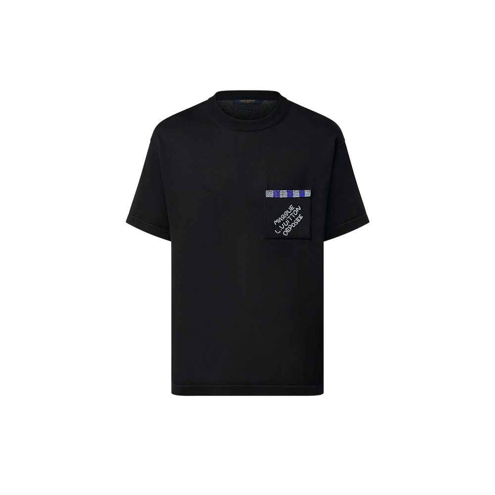 This smart black short-sleeved crewneck is elevated with embroidered beading in contrasting blue tones. It features a patch pocket on the chest with a Damier trim across the top and a Marque L.Vuitton deposee signature, bringing a distinguished touch to everyday casual looks.