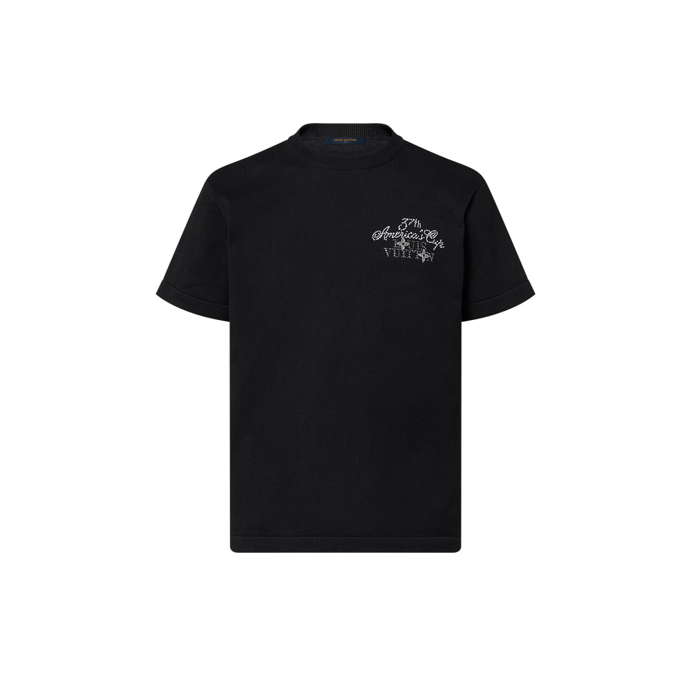 This sophisticated black crewneck celebrates the Louis Vuitton 37th Americas Cup. Crafted from fine organic cotton, it is embellished with a sophisticated LV Cup logo on the chest, picked out in delicate resin pearls and crystals. An embroidered tricolor Gaston label at the back adds a sporty accent to this versatile piece.