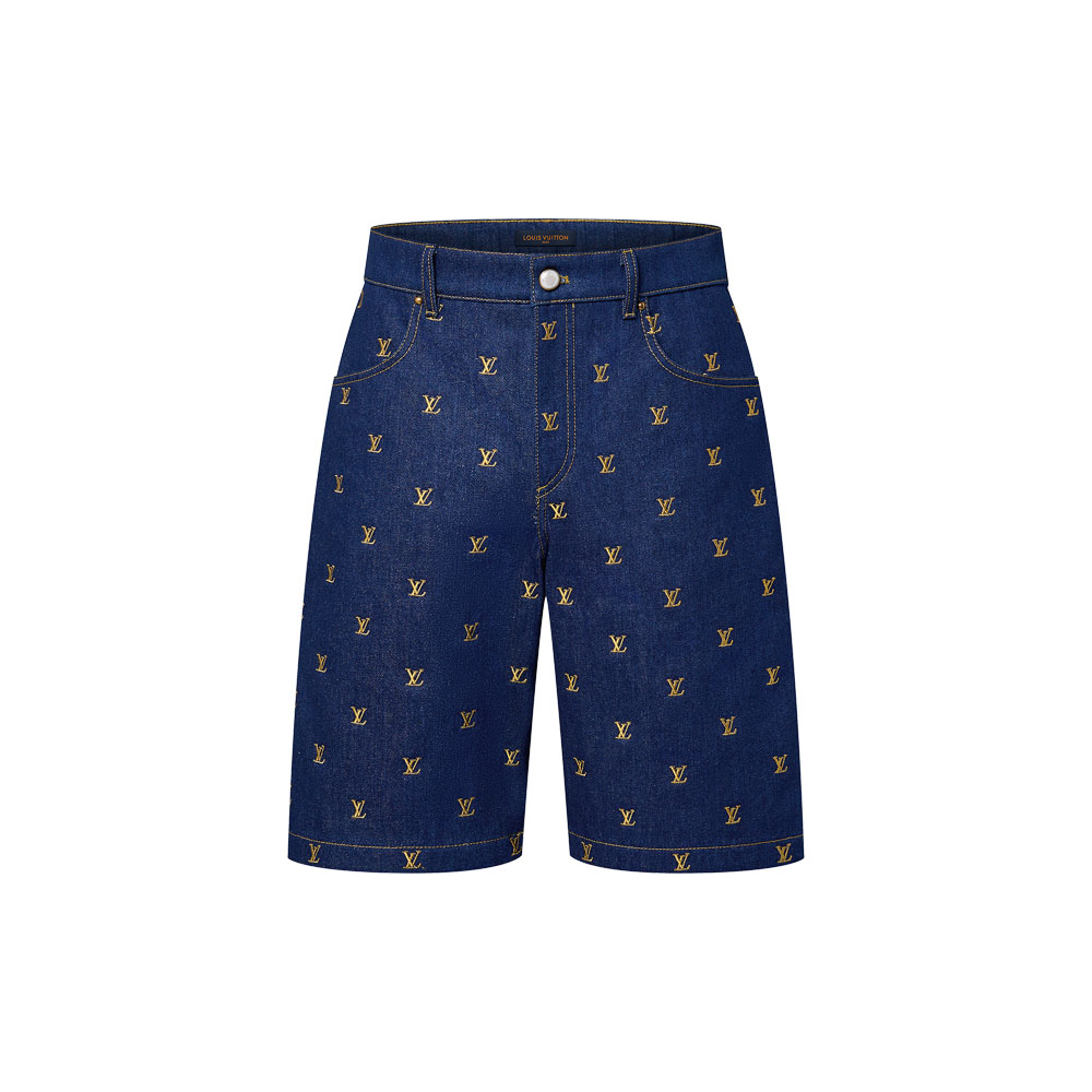 These smart denim shorts are embroidered with the SS24 Shows allover LV Blason motif in golden thread. They are crafted from deep indigo raw denim and fully lined for comfort. This versatile piece with its refined detailing has a matching short-sleeved shirt for a casual yet distinguished look.