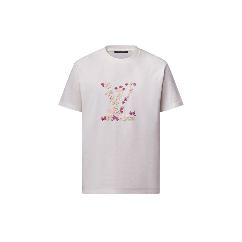 Introducing the Embroidered LV Tee: A stylish white cotton shirt with a breezy summer feel.