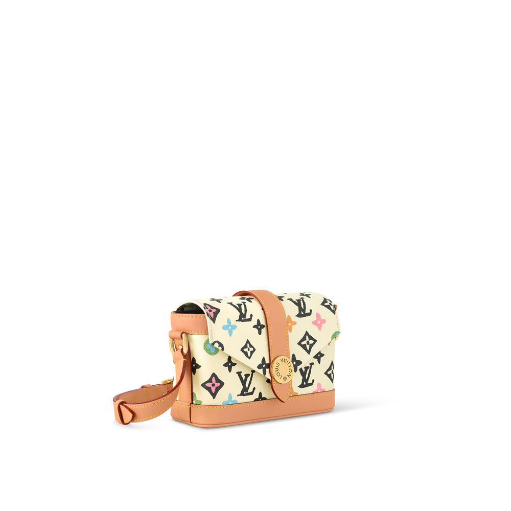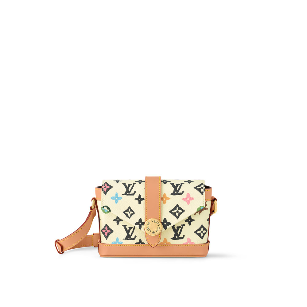 Inspired by the envelope design of the Louis Vuitton Cruiser travel bag, the Envelope Wearable Wallet features a triangular flap that closes with a Wavy magnetic button. The Monogram canvas has been reinterpreted by Tyler into his colourful Craggy style, meaning drawn by hand, with daisies and fox terriers added to the pattern.