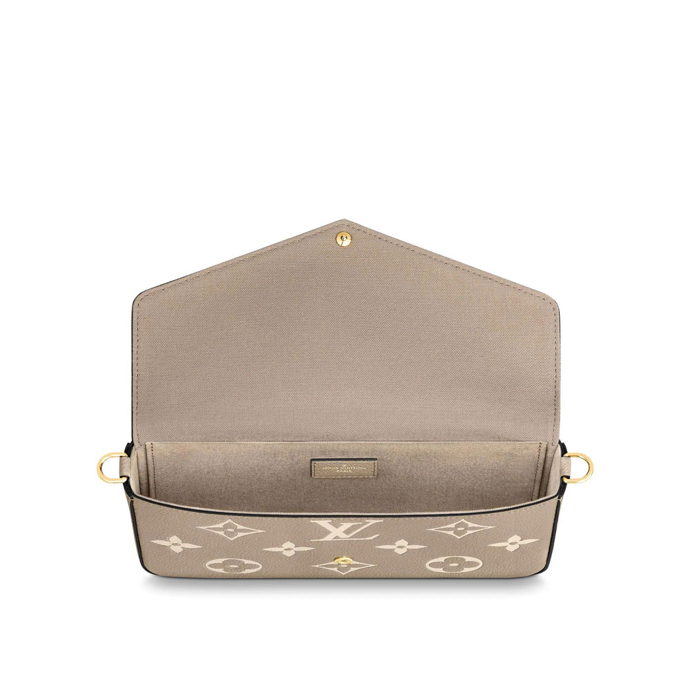 Made from Tourterelle Gray Monogram Empreinte leather. the Pochette Felicie is decorated with a Monogram print in a cream color. This stylish envelope-style pouch features two removable inside pockets. It can be carried as a clutch or worn on the shoulder. thanks to its detachable gold-color chain. Size: 21 x 12 x 3CM 8.3 x 4.7 x 1.2 inches Tourterelle Gray/Cream Monogram Empreinte embossed supple grained cowhide leather Textile lining Gold-color hardware Press-stud closure Large compartment Inside flat pocket Removable zipped pocket Removable flat pocket with 8 card slots Chain:Removable