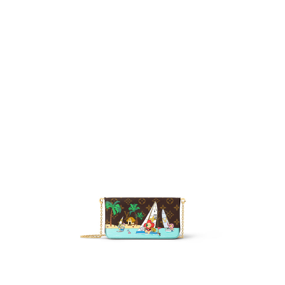 For winter 2023, Louis Vuittons mascot Vivienne travels the world looking for adventure. On the Monogram coated canvas of this Felicie Pochette, Vivienne is racing in the LV Sailing Cup, followed by her friend Noe, and Petula not far behind. The pouch includes a removable flat pocket with eight card slots.